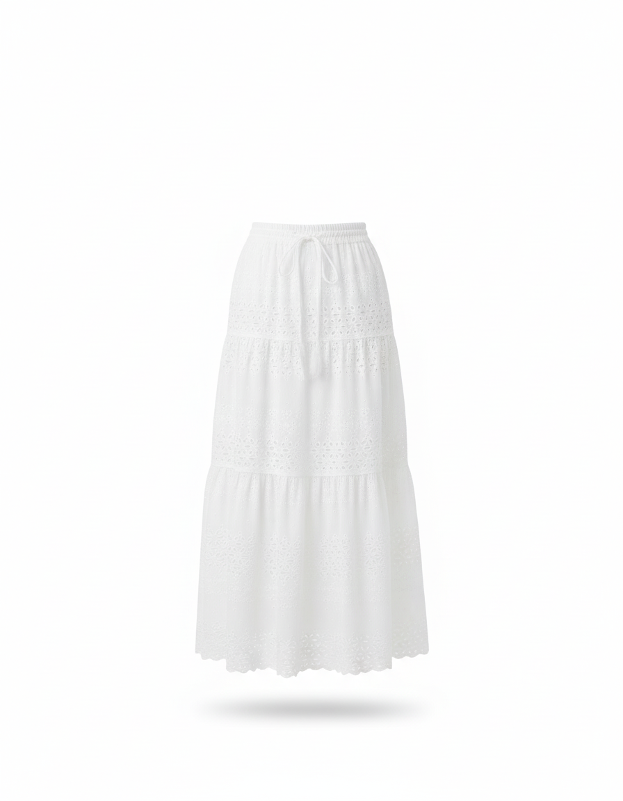 Cette jupe longue est de couleur blanche. Elle présente des motifs de dentelle ajourée et une coupe à plusieurs niveaux.