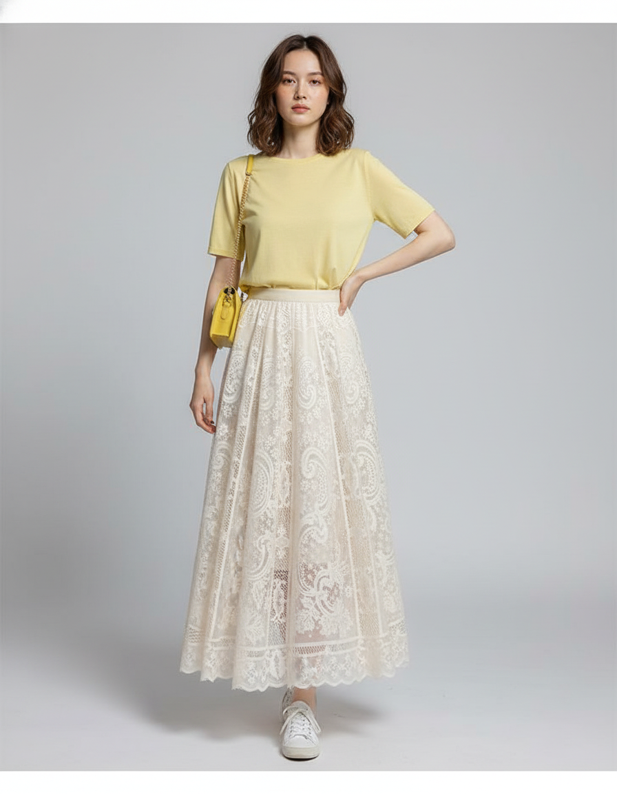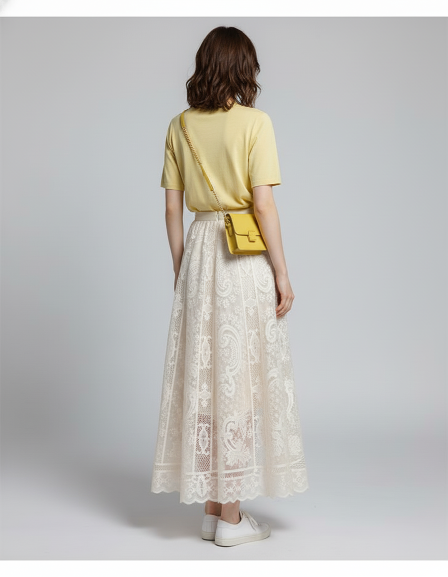 A young woman with shoulder-length, wavy dark brown hair stands against a plain light grey background, looking directly at the camera with a neutral expression. She is wearing a pastel yellow, short-sleeved t-shirt tucked into a long, cream-colored lace maxi skirt. The skirt features an intricate, possibly paisley or floral, lace pattern throughout its length, with a visible lining underneath that appears to end above the bottom hem of the lace, creating a subtly sheer effect at the very bottom. The hem of the skirt has a delicate, scalloped lace edge. She is wearing white canvas sneakers with white laces. A small, bright yellow cross-body bag with a gold chain strap hangs over her right shoulder. Her left hand is placed on her hip, while her right arm hangs relaxed by her side. The overall look is light, airy, and casually elegant.