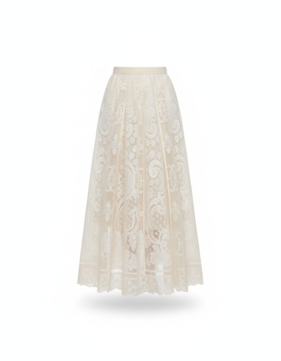 Adoptez l'élégance intemporelle avec notre jupe longue en dentelle écrue, parfaite pour un look raffiné et aérien.