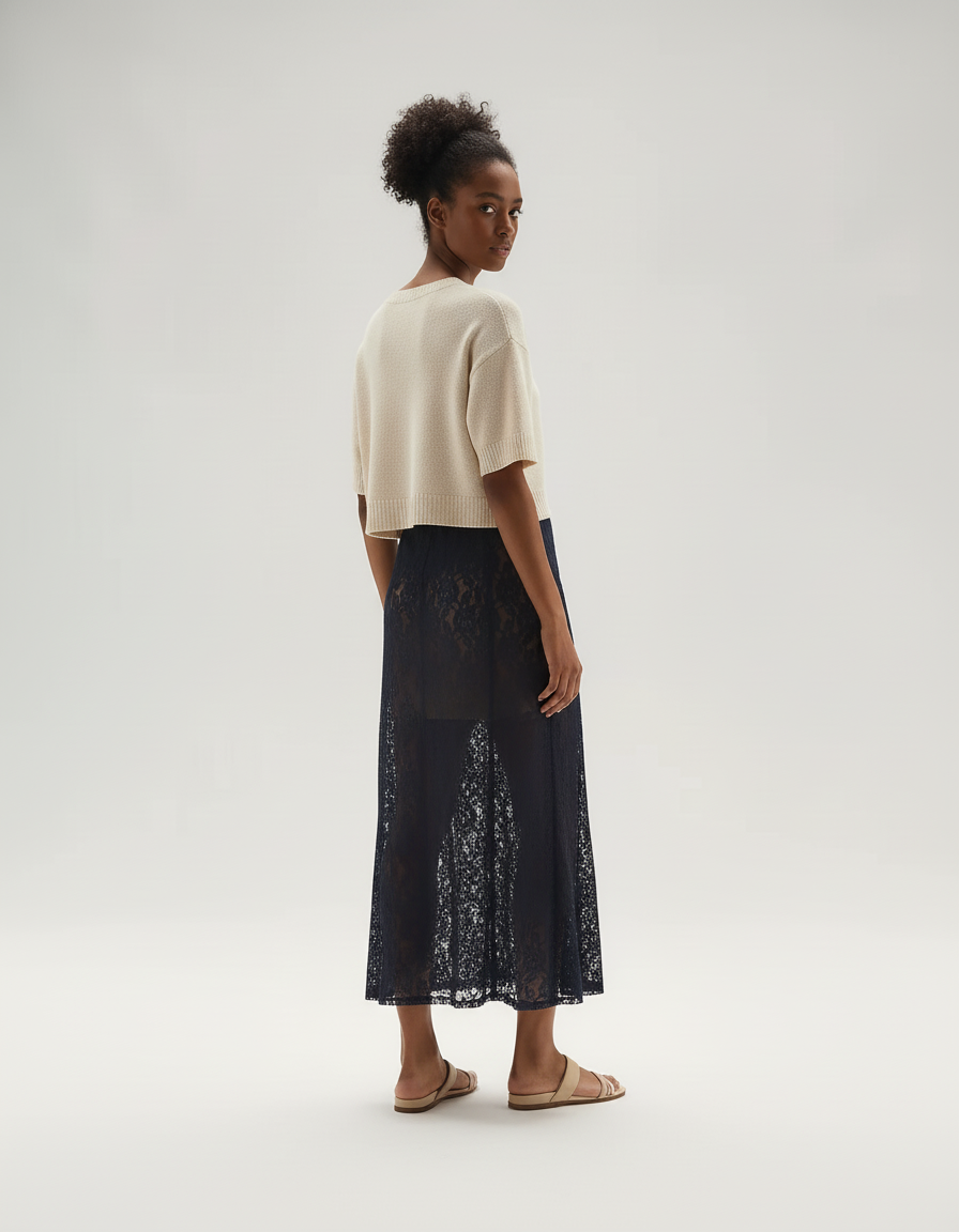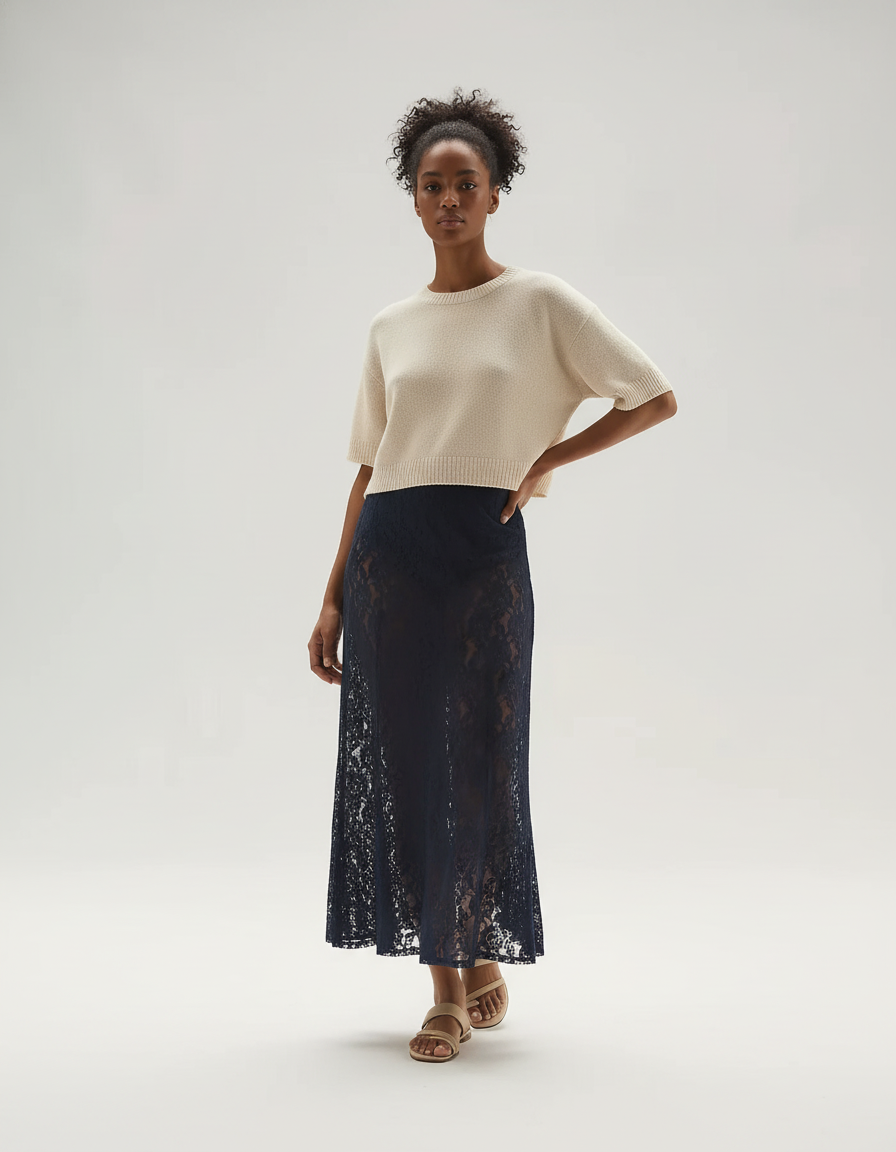 La Jupe Longue Dentelle Fleurie Transparente Élégante en bleu marine est votre alliée pour toutes les occasions. Pour une allure décontractée-chic en journée, associez-la à un simple t-shirt en coton ou un pull en maille fine, comme sur l'image, et des sandales plates. Les jours plus frais, une veste en jean ou un blouson court complétera parfaitement votre tenue. Le soir venu, transformez votre look en un clin d'œil : un top en soie ou un chemisier fluide, des talons élégants et quelques bijoux discrets suffiront à créer une silhouette sophistiquée et irrésistible, parfaite pour un dîner ou un événement spécial. Sa dentelle florale délicate apporte une touche de raffinement subtil.