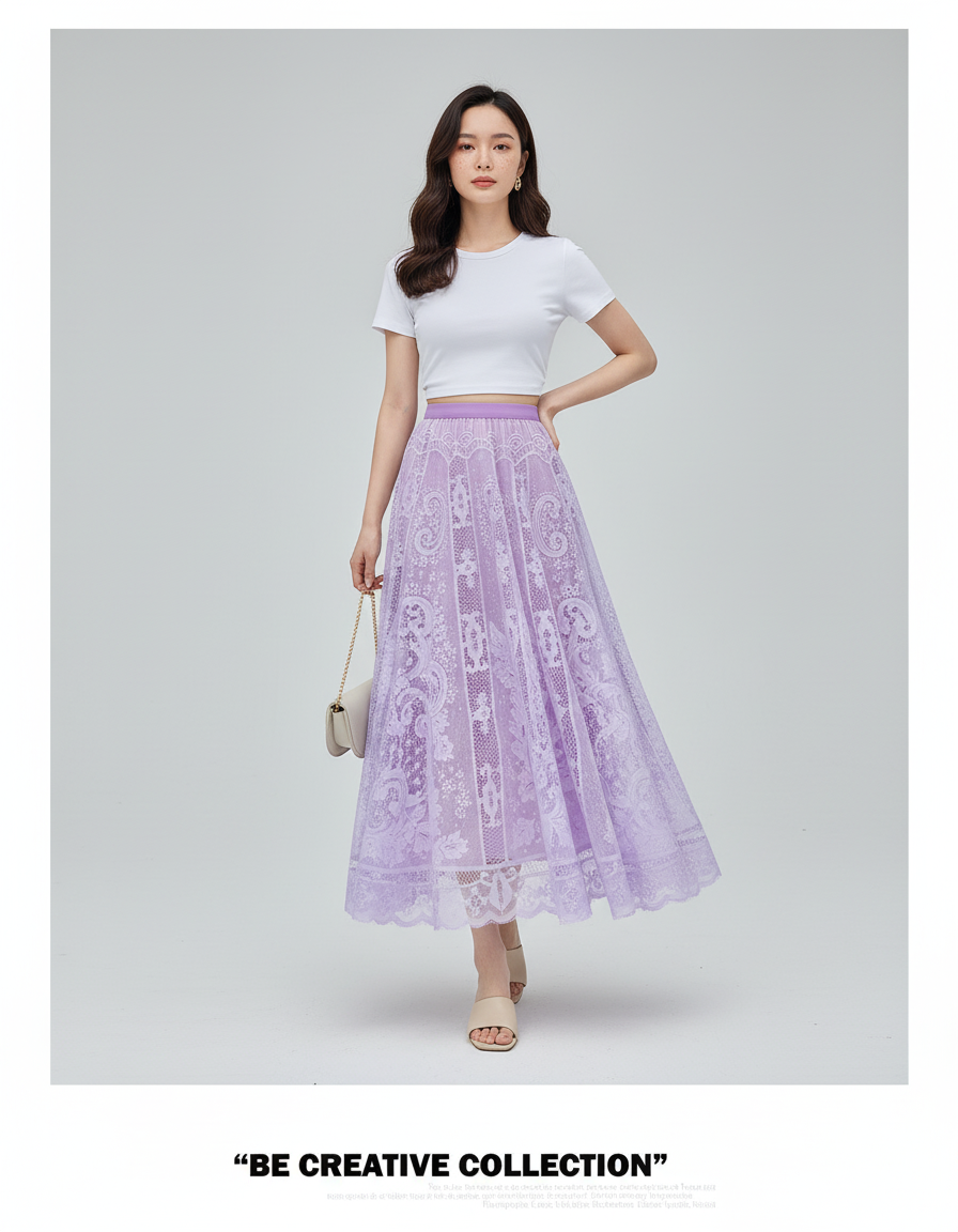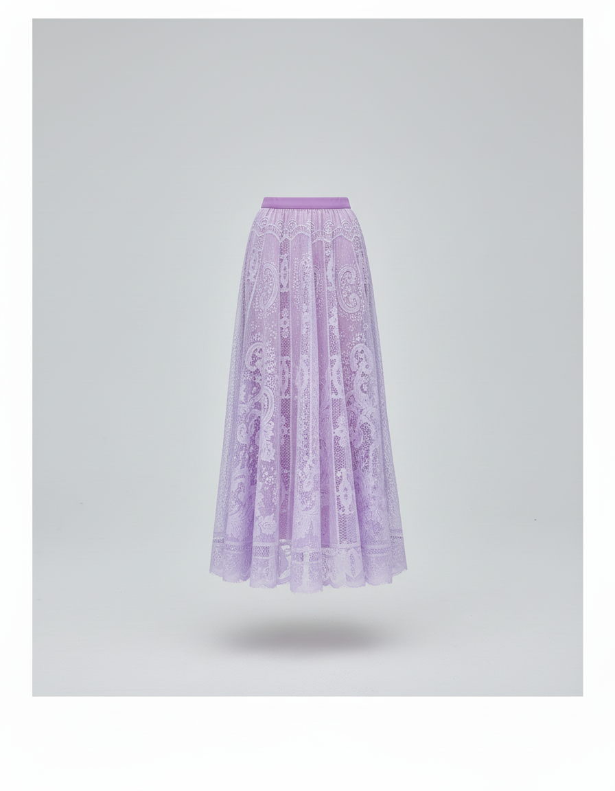 Ce qui distingue notre jupe évasée, c'est sa dentelle violette d'une finesse incomparable, travaillée pour créer un effet de transparence délicat et artistique. Loin des classiques, son motif élaboré et sa coupe ample confèrent une légèreté incomparable, offrant un confort absolu sans jamais compromettre le glamour. Chaque détail est pensé pour sublimer votre allure, faisant de cette jupe fluide en dentelle bien plus qu'un vêtement : une véritable œuvre d'art portable, un symbole de luxe moderne et d'individualité.