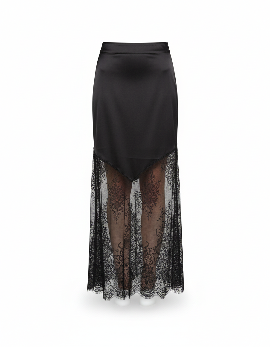 Cette jupe longue est composée d'une section supérieure opaque et d'une partie inférieure en dentelle transparente. La jupe affiche une coupe asymétrique.