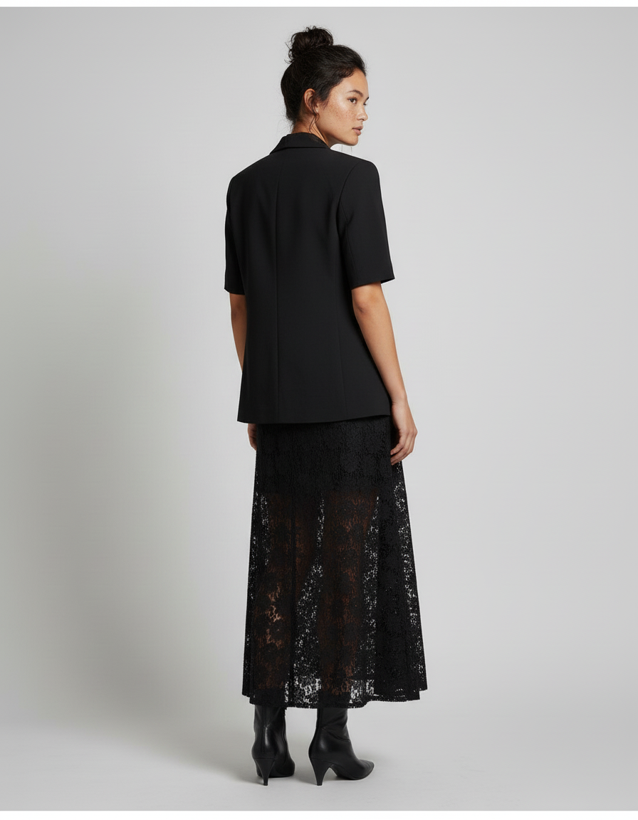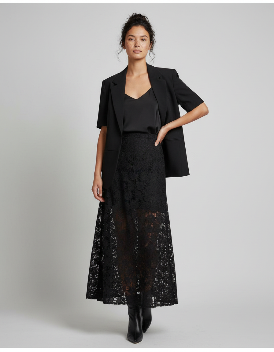 La Jupe Longue Dentelle Tulle noire est pensée pour transcender les attentes. Idéale pour une soirée glamour, associez-la à un top en soie et des talons fins pour une allure sophistiquée. Mais son potentiel va bien au-delà : pour un look audacieux et contemporain, enfilez un blazer court à manches courtes et des bottines, comme sur l'image, pour une silhouette moderne et affirmée. Pour une touche de décontraction chic en journée, un pull fin en cachemire ou un t-shirt blanc ajusté et des baskets épurées transformeront instantanément votre silhouette, prouvant sa polyvalence à travers les saisons et les événements.