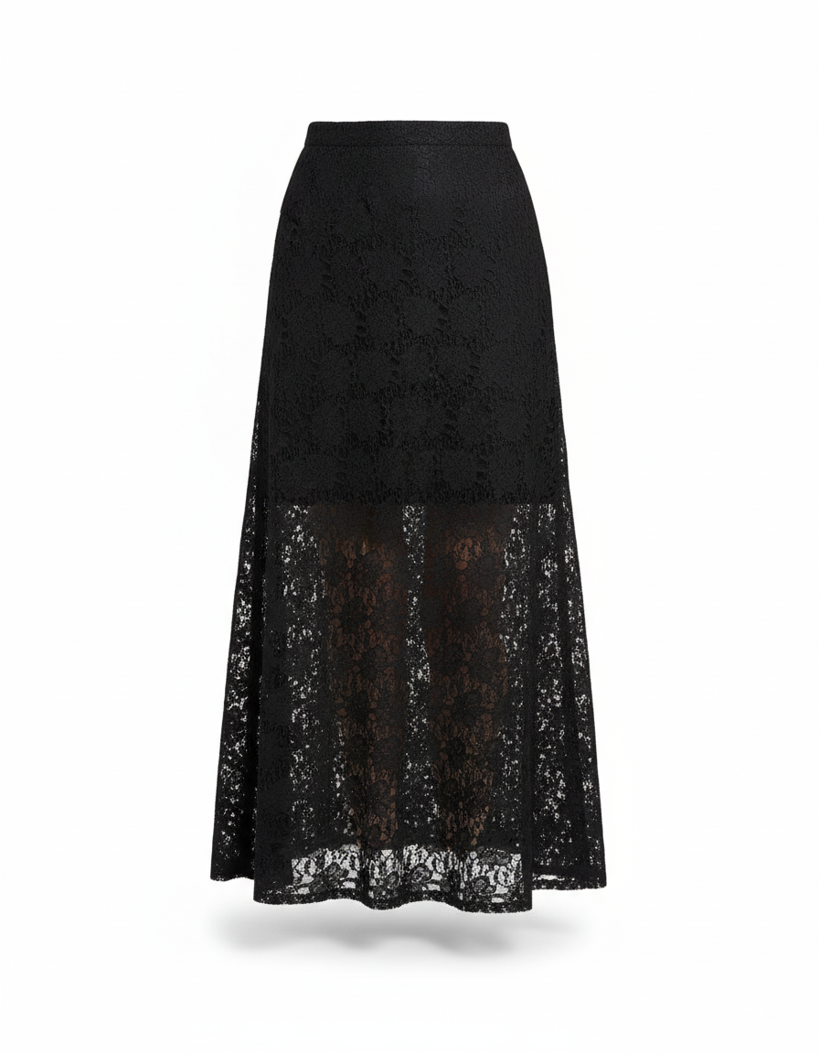 Cette jupe longue est confectionnée en dentelle noire. Elle présente une longueur mi-mollet et intègre une doublure courte sur la partie supérieure.