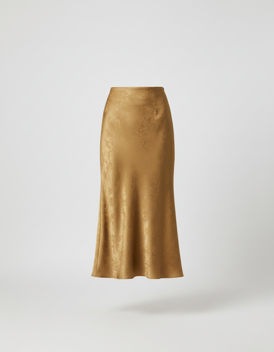 Cette jupe présente une coupe longue et une teinte dorée. Elle est dotée d'un motif discret visible sur l'ensemble du tissu.