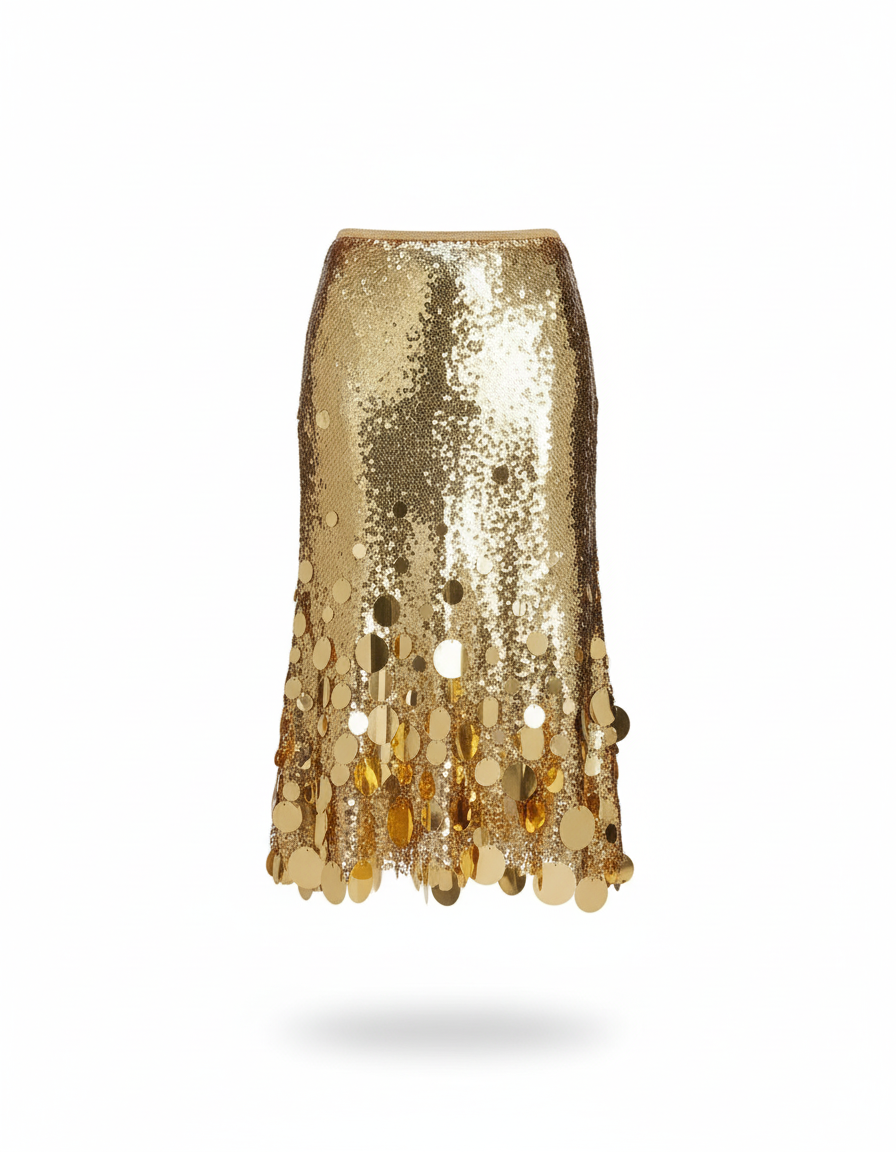 - Ornementation: Paillettes recouvrant la surface de la jupe.