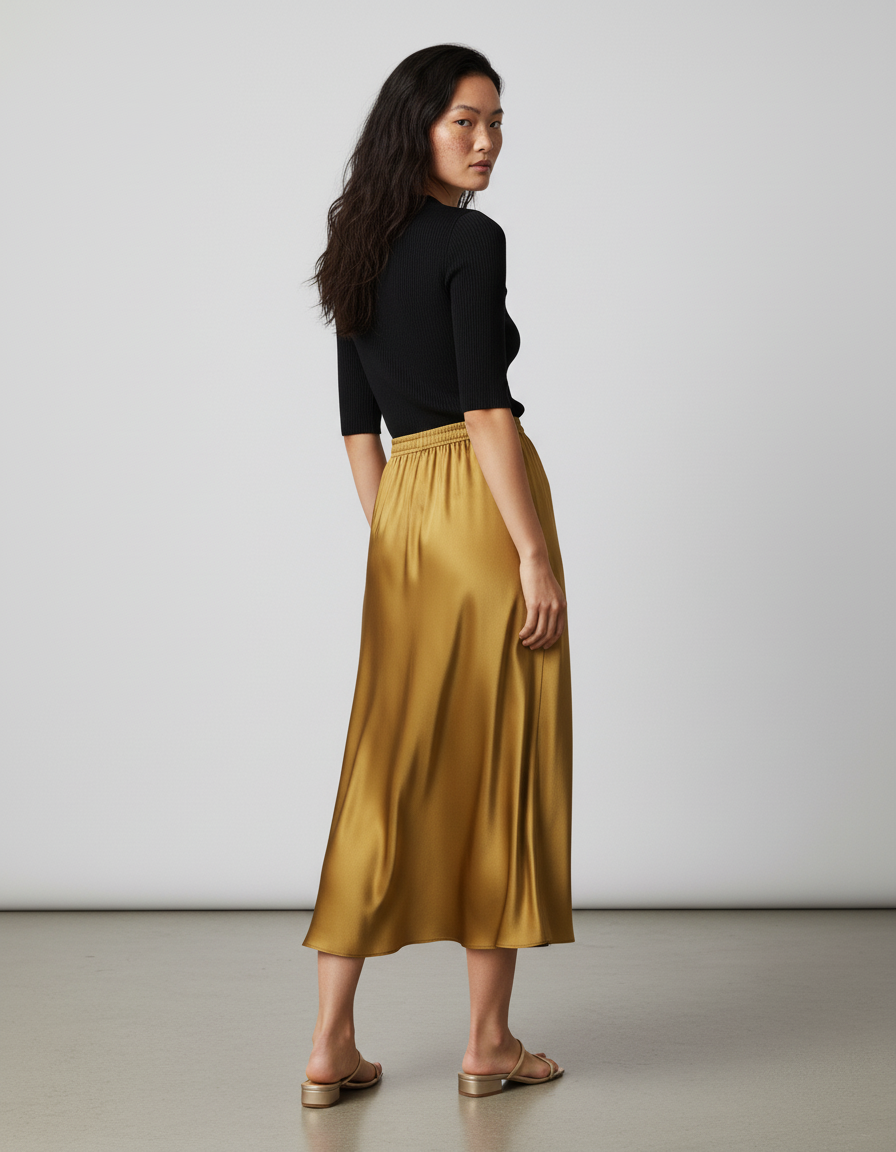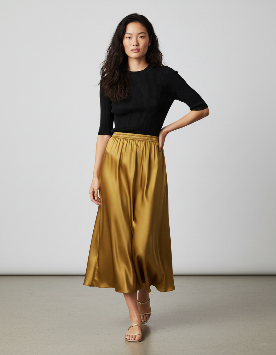 Here's a description of the fashion items worn by the model in the image: The model is wearing a chic and elegant outfit consisting of: 1. **Top:** A fitted, black ribbed knit top with a crew neck and elbow-length sleeves. 2. **Skirt:** A flowy, midi-length satin skirt in a rich golden or olive-gold color. It features an elastic waistband, giving it a comfortable yet polished look. 3. **Shoes:** Simple, elegant metallic gold strappy sandals with a low heel, complementing the skirt's color and sheen.
