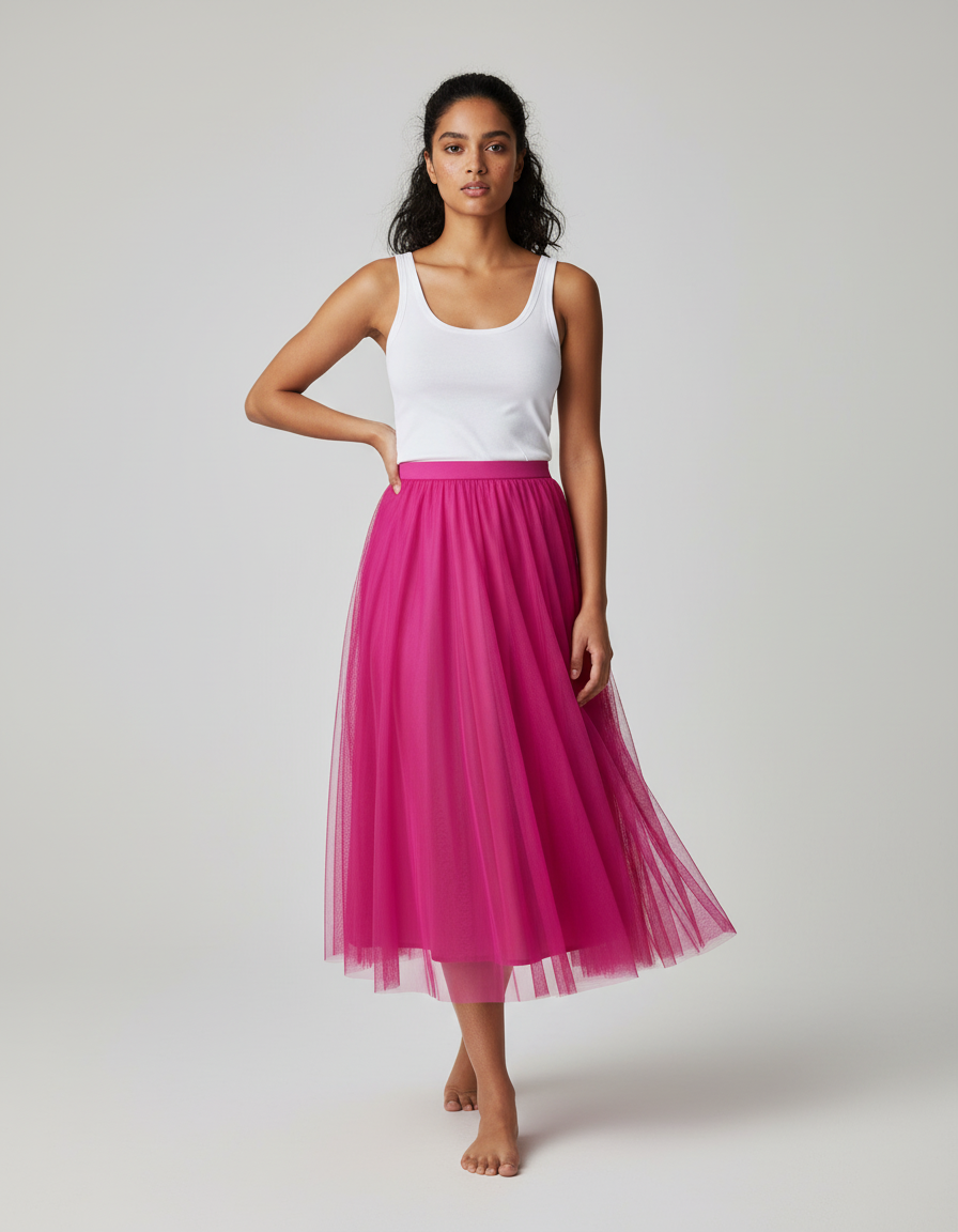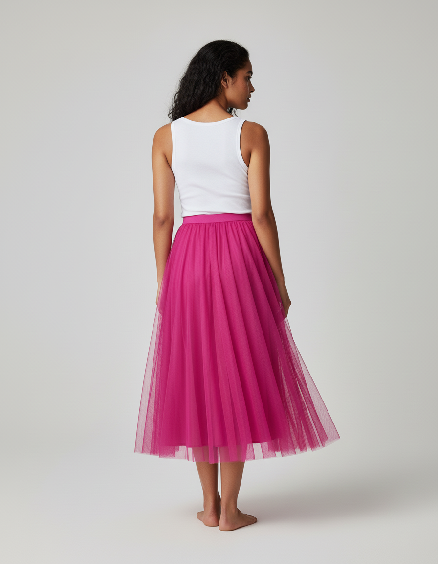 Ce qui la distingue ? Un tulle de qualité supérieure, subtilement doublé, qui garantit une opacité parfaite et un confort absolu sans jamais sacrifier sa légèreté. La richesse de son rose fuchsia, vibrant et chic, transforme chaque tenue en une déclaration de style unique. Loin des jupes classiques, la 'Jupe Longue Doublée' est une œuvre de confection, promettant une allure distinguée et un bien-être absolu, faisant d'elle un investissement intemporel dans votre garde-robe de luxe.