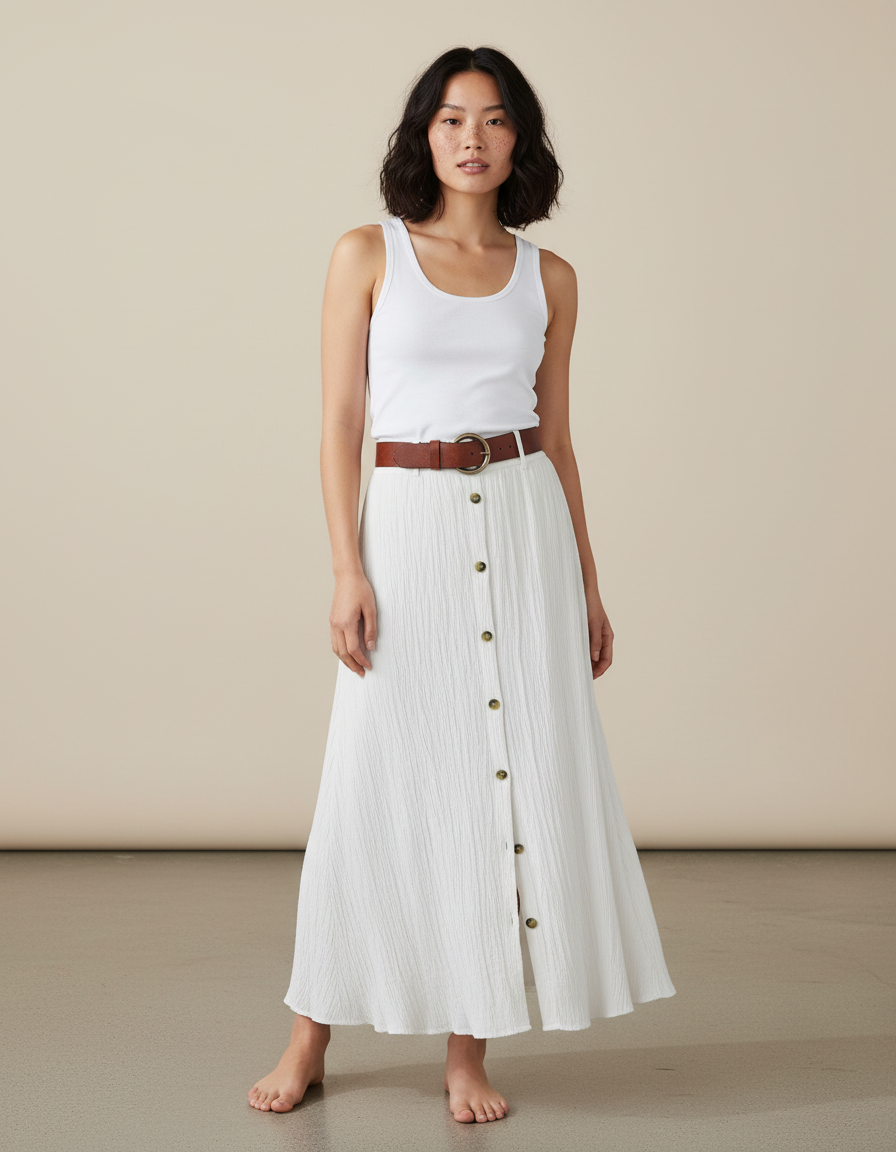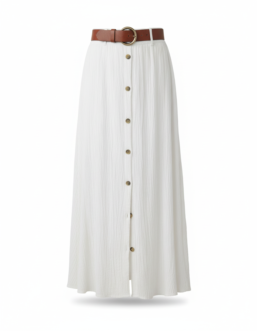 Cette jupe est longue et présente une fermeture boutonnée sur le devant. Le tissu est de couleur blanche et possède une texture visible.