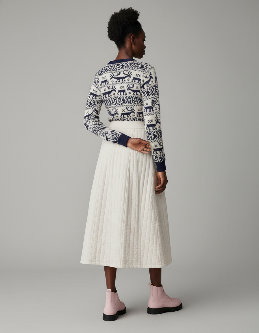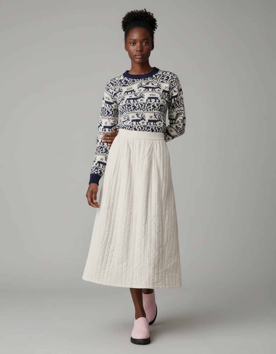 Sa polyvalence est un atout majeur pour composer des looks variés. Pour un style hivernal décontracté et chic, associez-la à un pull en maille fine (comme le modèle Fair Isle sur la photo) et des bottines plates. En journée, elle se marie parfaitement avec une chemise en soie et des mocassins pour une allure sophistiquée au bureau. Osez un crop top ou un body élégant et des accessoires audacieux pour une touche plus affirmée en soirée. La Jupe Longue Écru Matelassée Chic est la pièce maîtresse qui sublime votre style, en toute circonstance.