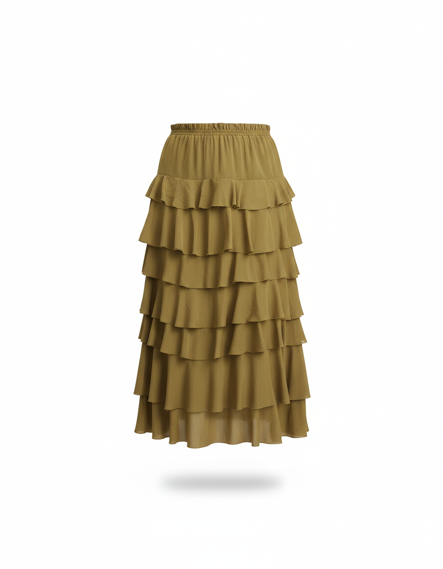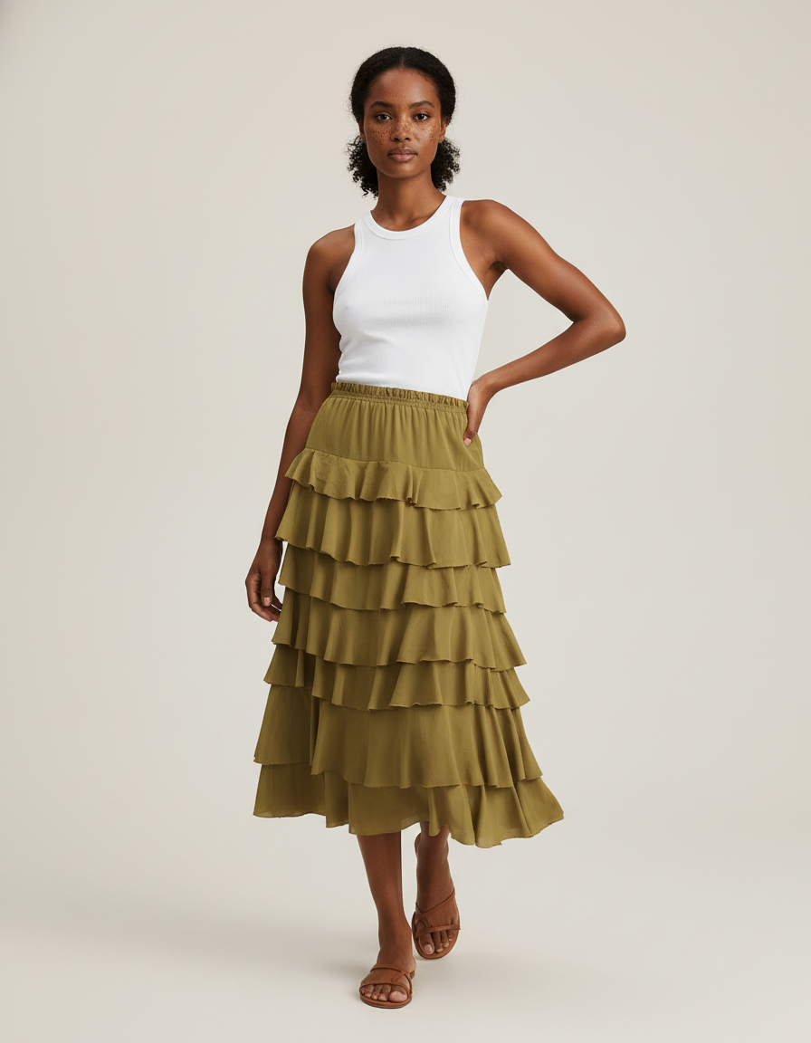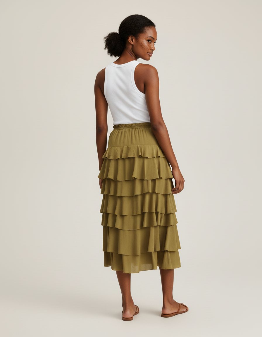 Conçue pour une aisance inégalée, notre jupe longue à taille élastique en coton vert olive incarne le confort sans compromis. Sa matière légère et respirante épouse vos mouvements avec une grâce naturelle, tandis que ses multiples volants créent un jeu de textures et un tombé parfaitement fluide à chaque pas. L'élastique discrètement intégré assure un ajustement idéal, vous offrant une liberté totale, du matin au soir. C'est la promesse d'une silhouette aérienne et d'une sensation de bien-être constante.