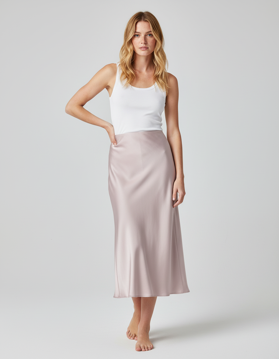 Découvrez la Jupe Longue Élégante, une pièce maîtresse conçue pour sublimer votre silhouette avec grâce. Confectionnée dans un satin fluide d'une délicate teinte rose, cette jupe évasée offre un tombé impeccable qui caresse la jambe à chaque mouvement. Son éclat subtil et sa texture soyeuse en font le choix idéal pour vos soirées et événements spéciaux. Pour une allure de gala, mariez-la avec un top ajusté en soie ou un chemisier fluide et des talons. Sa fluidité garantit une élégance naturelle et une présence remarquée, sans effort.