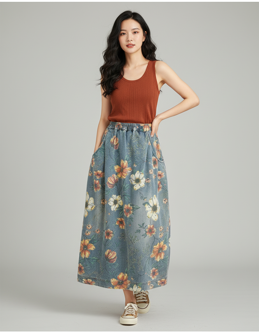 Adoptez un look décontracté et élégant avec notre jupe longue en jean évasée, ornée d'un charmant motif floral.