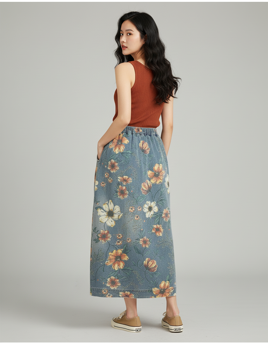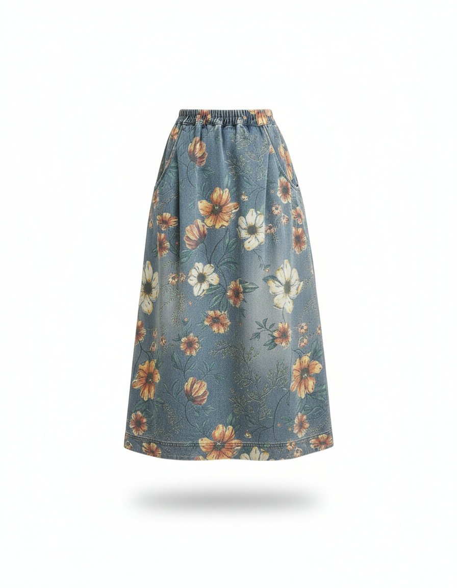 Cette jupe est un vêtement long en jean. Elle présente une taille élastique et un motif floral imprimé sur toute sa surface.
