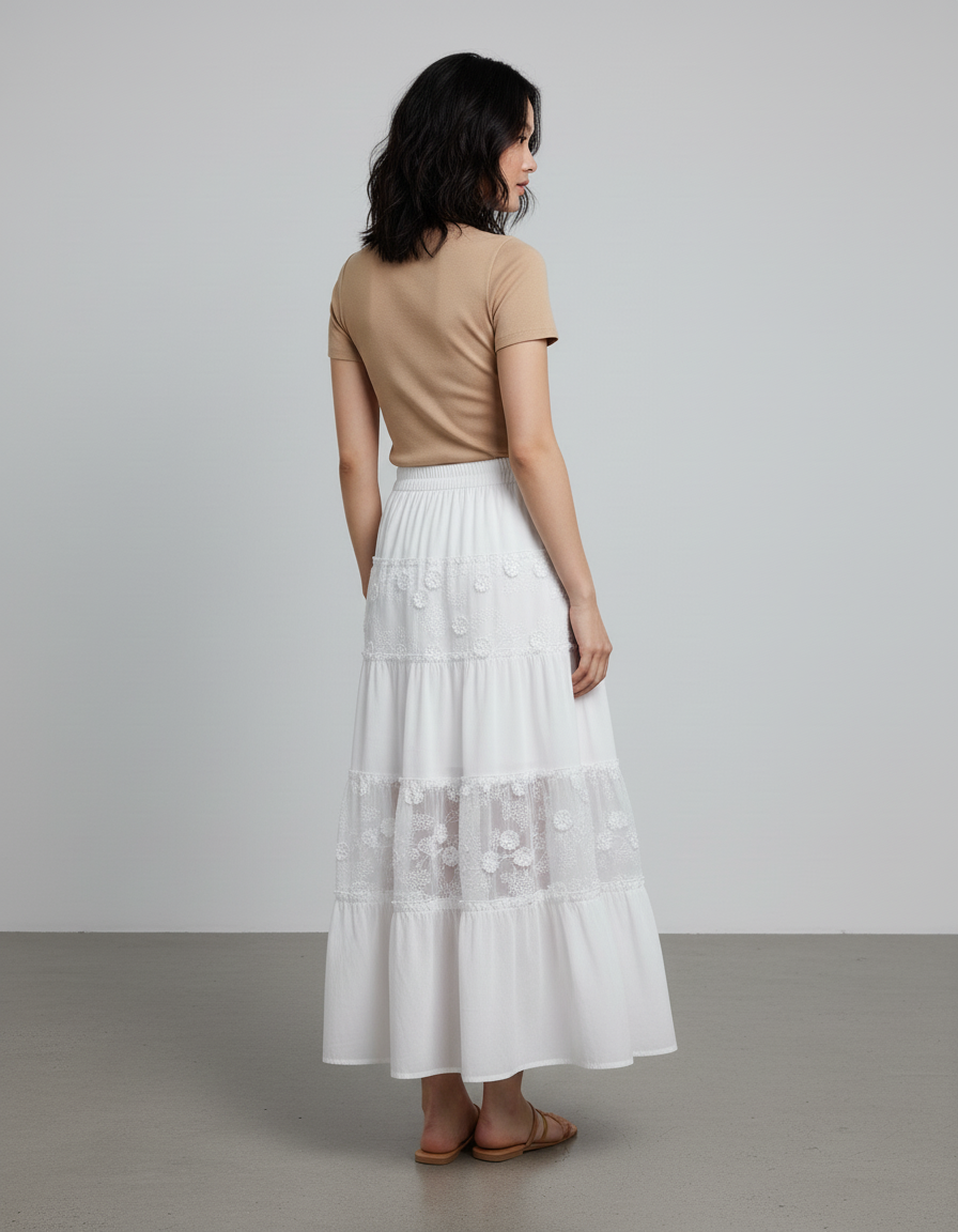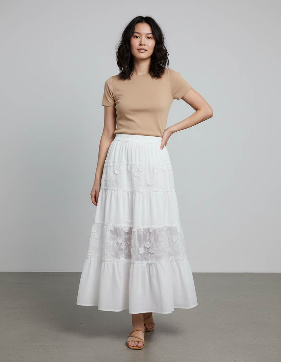 Jupe Longue En Lin Blanc à Volants et Dentelle