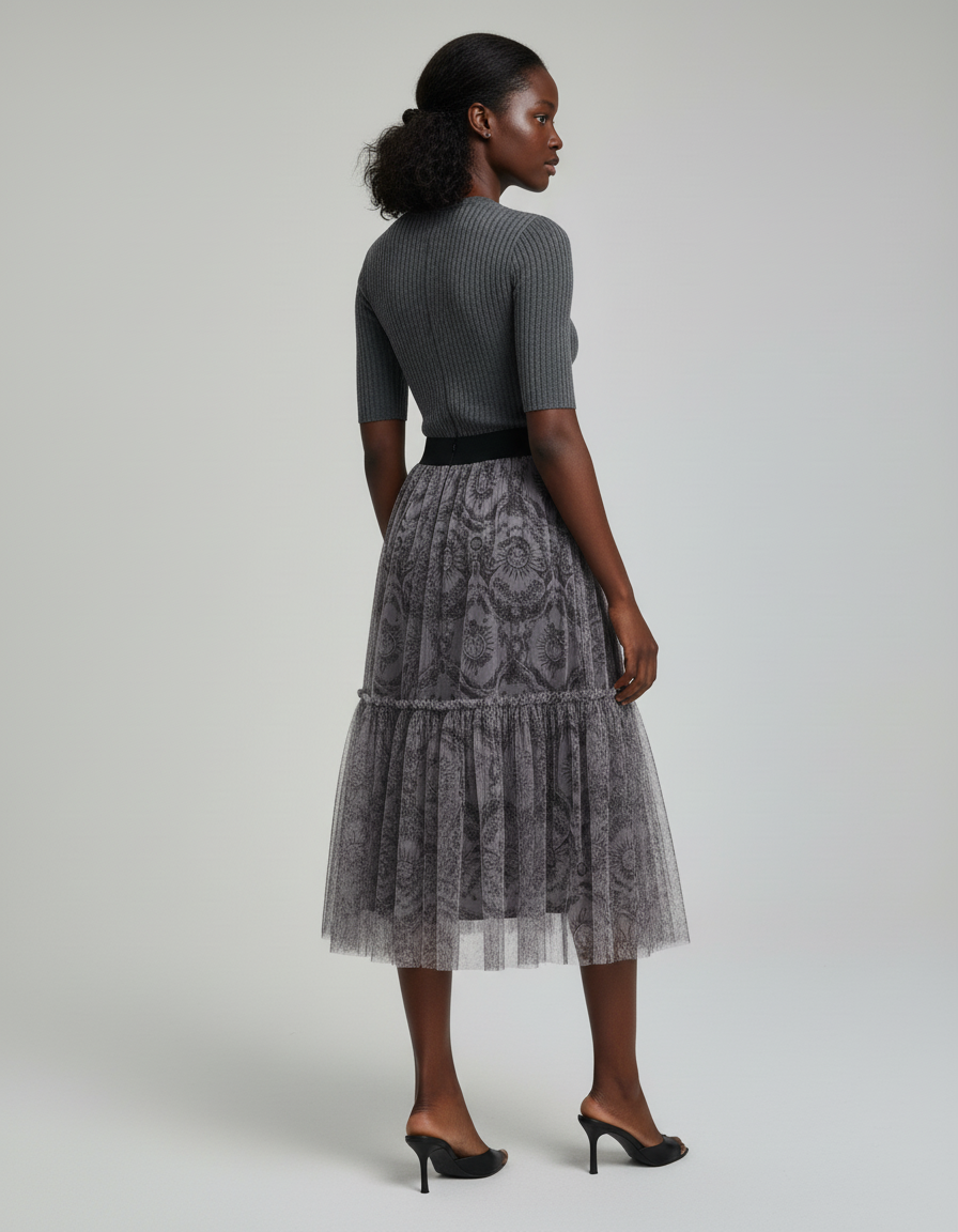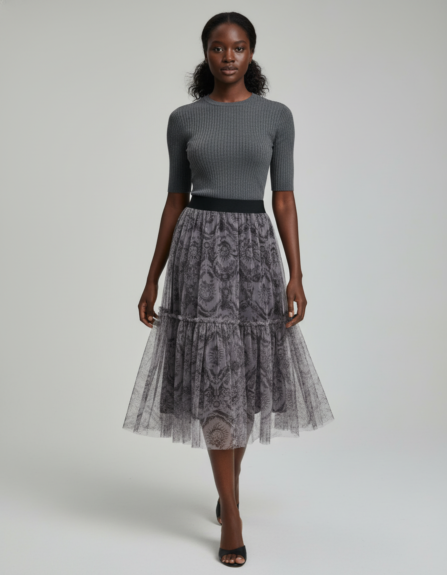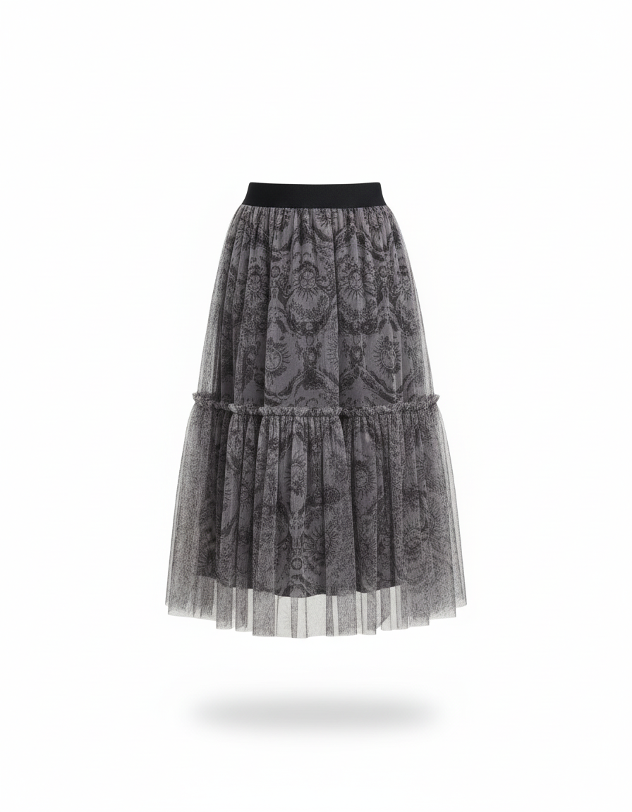 Plongez dans un univers d'élégance audacieuse avec notre Jupe Longue En Mesh. Conçue pour la femme moderne qui ne transige ni sur le style ni sur le confort, cette pièce maîtresse transforme chaque mouvement en une déclaration de grâce. Sa silhouette ample en tulle gris, délicatement structurée par des volants aériens, offre une liberté inégalée tout en sublimant votre allure. Elle est idéale pour celles qui recherchent une sophistication discrète mais impactante, capable de s'adapter à toutes les occasions, du brunch chic à la soirée glamour.