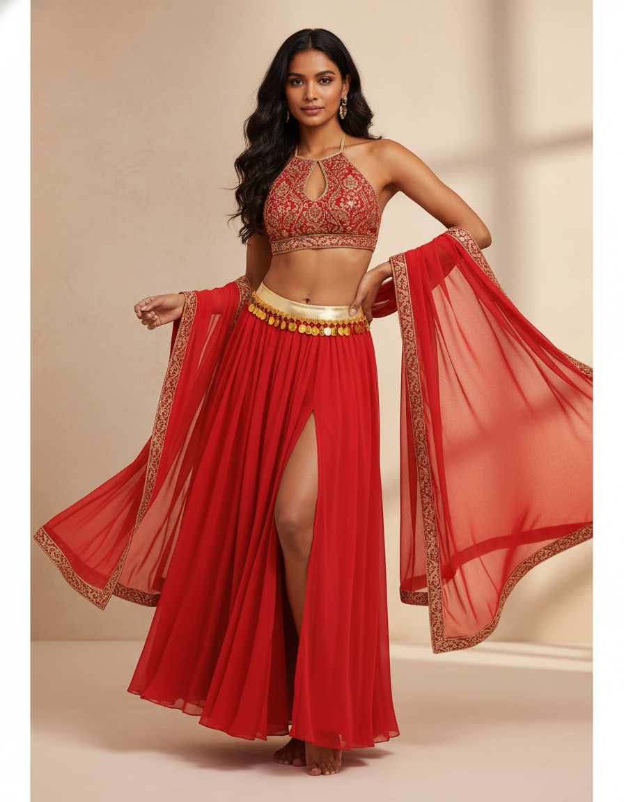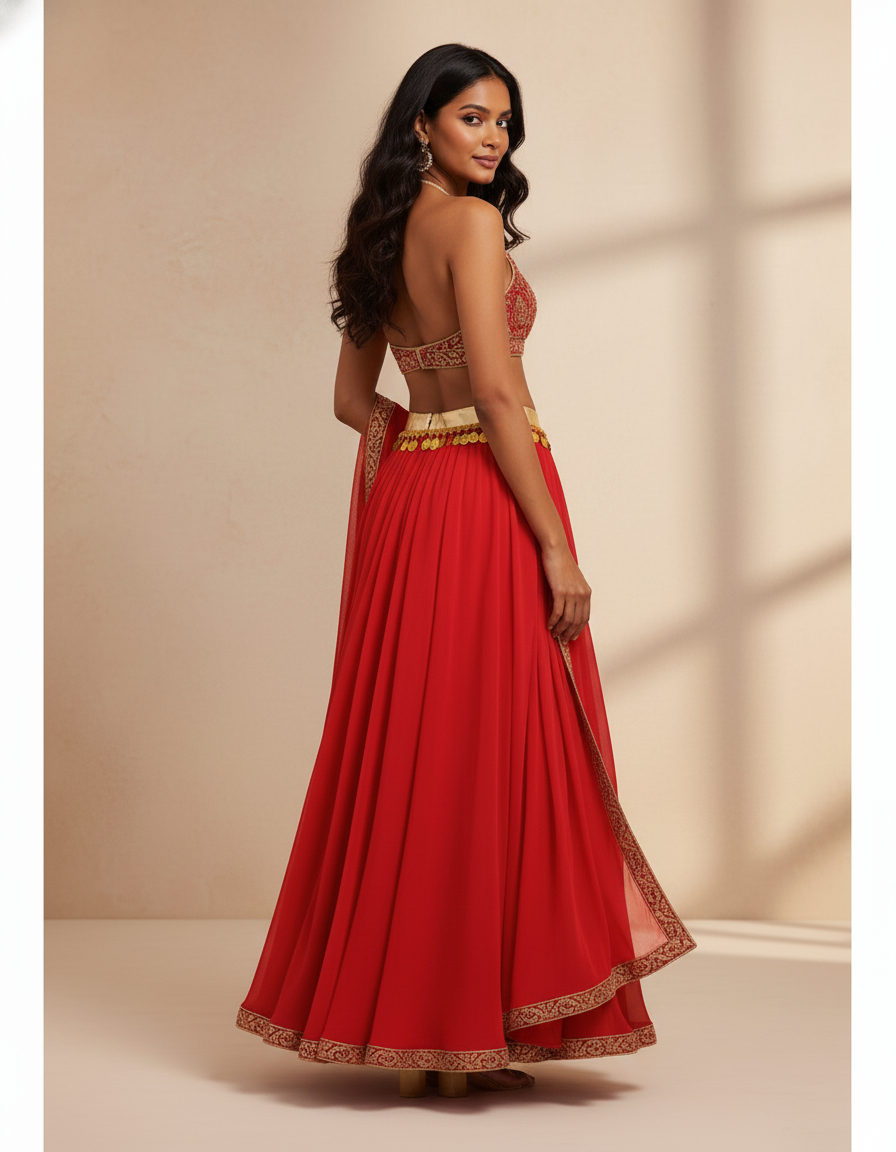 Idéale pour les mariages indiens, les célébrations festives ou les soirées estivales chics, cette jupe est une pièce maîtresse polyvalente. Associez-la à un crop top brodé pour un ensemble traditionnel et glamour, ou optez pour une blouse fluide en soie pour une élégance plus contemporaine. Complétez votre look avec des sandales à talons et des bijoux dorés pour un effet des plus saisissants. Elle promet de transformer chaque apparition en un moment inoubliable, alliant sophistication et aisance.