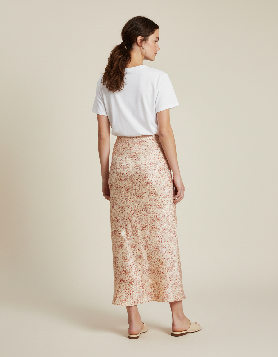Idéale pour la femme qui recherche une sophistication sans effort, cette jupe est votre alliée parfaite pour les journées de bureau stylées, les déjeuners en ville ou les soirées estivales. Sa fluidité et son imprimé unique la distinguent des créations classiques, offrant une polyvalence remarquable : associez-la à un simple t-shirt blanc pour un look décontracté chic, ou à une blouse en soie pour une élégance plus formelle. Plus qu'un vêtement, c'est un investissement dans une pièce intemporelle qui célèbre l'artisanat et la beauté de la soie véritable.