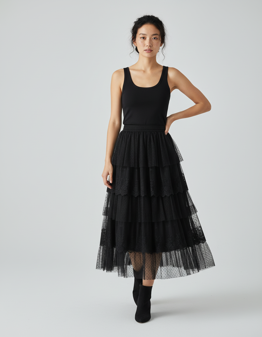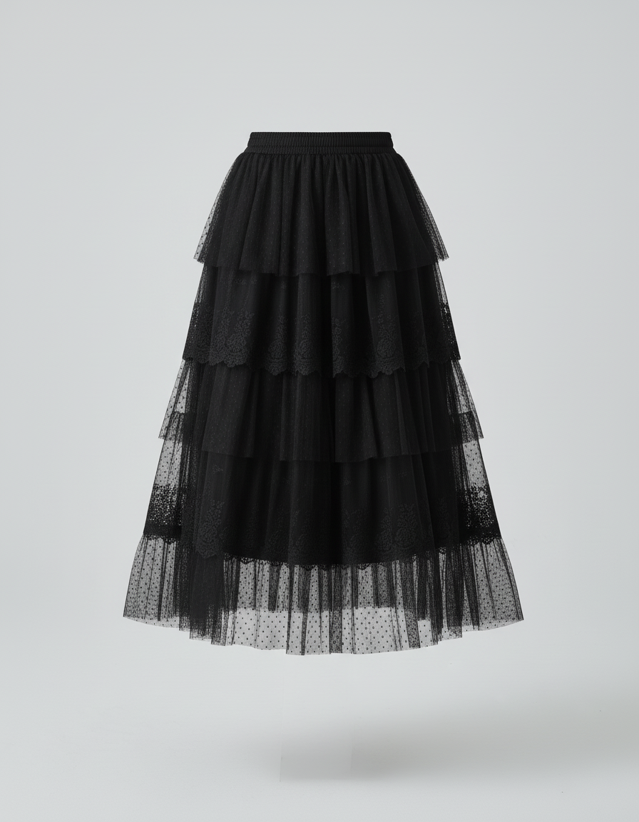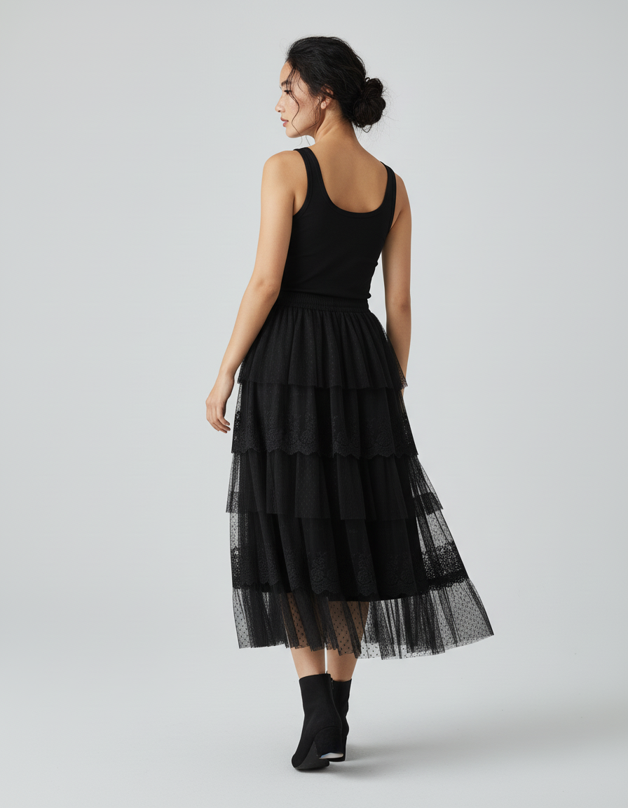 Confectionnée dans un tulle noir vaporeux, notre Jupe Longue Étagée incarne la légèreté et le raffinement. Ses volants superposés créent un mouvement aérien et un tombé impeccable, qui sublime votre silhouette sans jamais la contraindre. La taille élastiquée, discrète et confortable, assure un ajustement parfait et une liberté totale, vous permettant de danser toute la nuit ou de flâner avec une aisance inégalée. Chaque couche de tulle est pensée pour offrir une texture délicate et une opacité juste, garantissant un confort absolu du matin jusqu'au soir, sans compromis sur l'élégance.