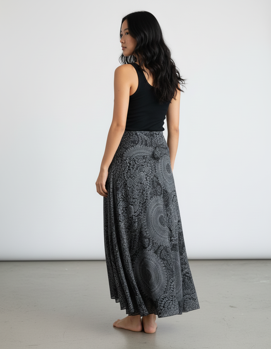 Conçue en mousseline légère, la Jupe Longue Été Fluide incarne la quintessence du confort estival. Son tombé évasé sublime chaque silhouette, offrant une liberté de mouvement incomparable. Que vous flâniez en ville ou dansiez sous les étoiles, sa matière aérienne caresse la peau sans jamais entraver vos pas. Le motif cachemire noir et gris, intemporel et sophistiqué, ajoute une touche d'élégance discrète, facile à assortir et à rehausser.