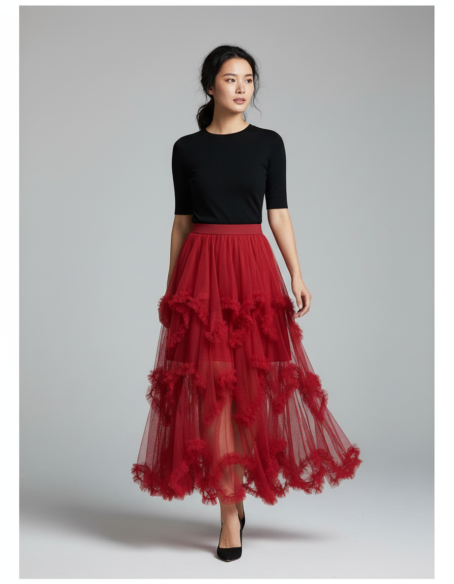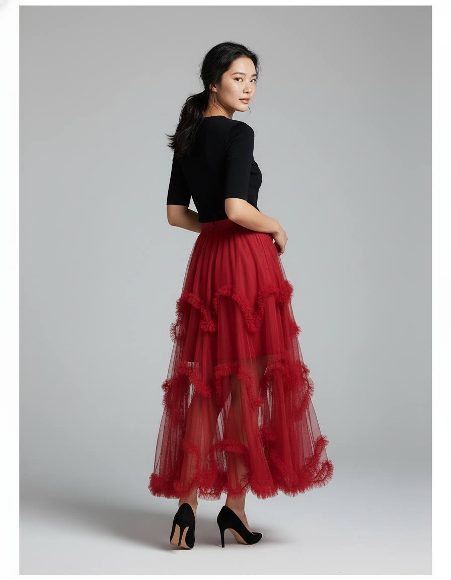 La Jupe Longue Fantaisie est une célébration de l'audace et de l'élégance contemporaine. Conçue pour la femme qui ose affirmer son style, cette pièce maîtresse transforme chaque apparition en un moment inoubliable. Laissez-vous envelopper par le mouvement aérien de son tulle rouge flamboyant et rayonnez d'une confiance nouvelle. Elle est l'atout idéal pour celles qui recherchent une silhouette distinctive, capable de captiver les regards avec raffinement, que ce soit pour une soirée glamour ou pour sublimer un événement spécial.