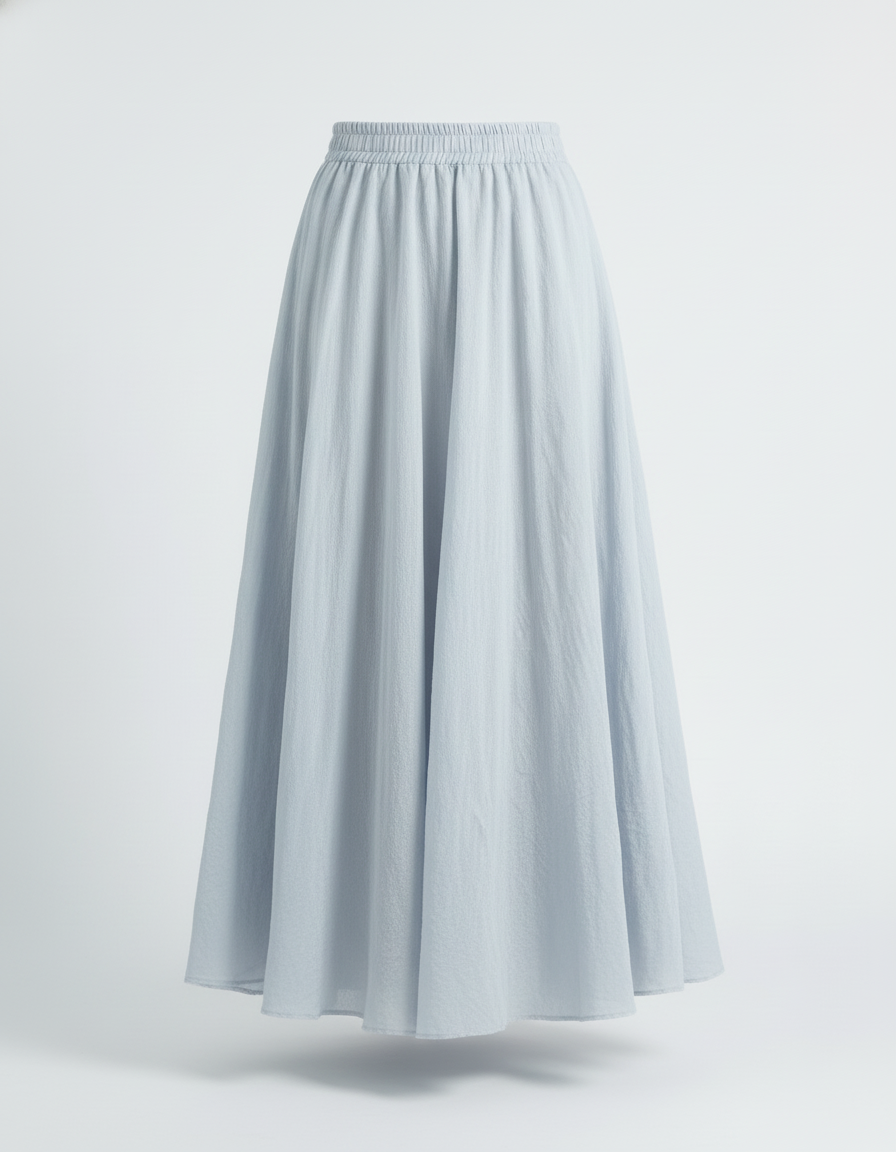 Cette jupe est une pièce longue dotée d'une taille élastique. Le tissu présente une texture légèrement froissée.