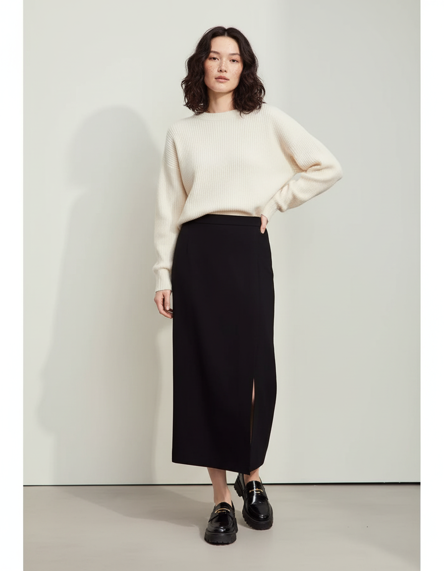 Polyvalente par excellence, cette jupe noire se prête à toutes les occasions. Pour un look professionnel affûté, associez-la à un pull en maille fine et des bottines. En week-end, elle se marie parfaitement avec un gros pull douillet et des mocassins pour une allure décontractée-chic. Pour une soirée spéciale, osez la combiner avec un chemisier en soie et des talons hauts, révélant sa fente avec une subtilité captivante. Un investissement durable qui sublime votre garde-robe hivernale avec une touche de raffinement intemporel.