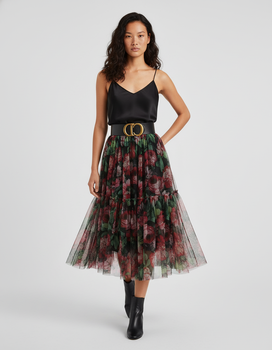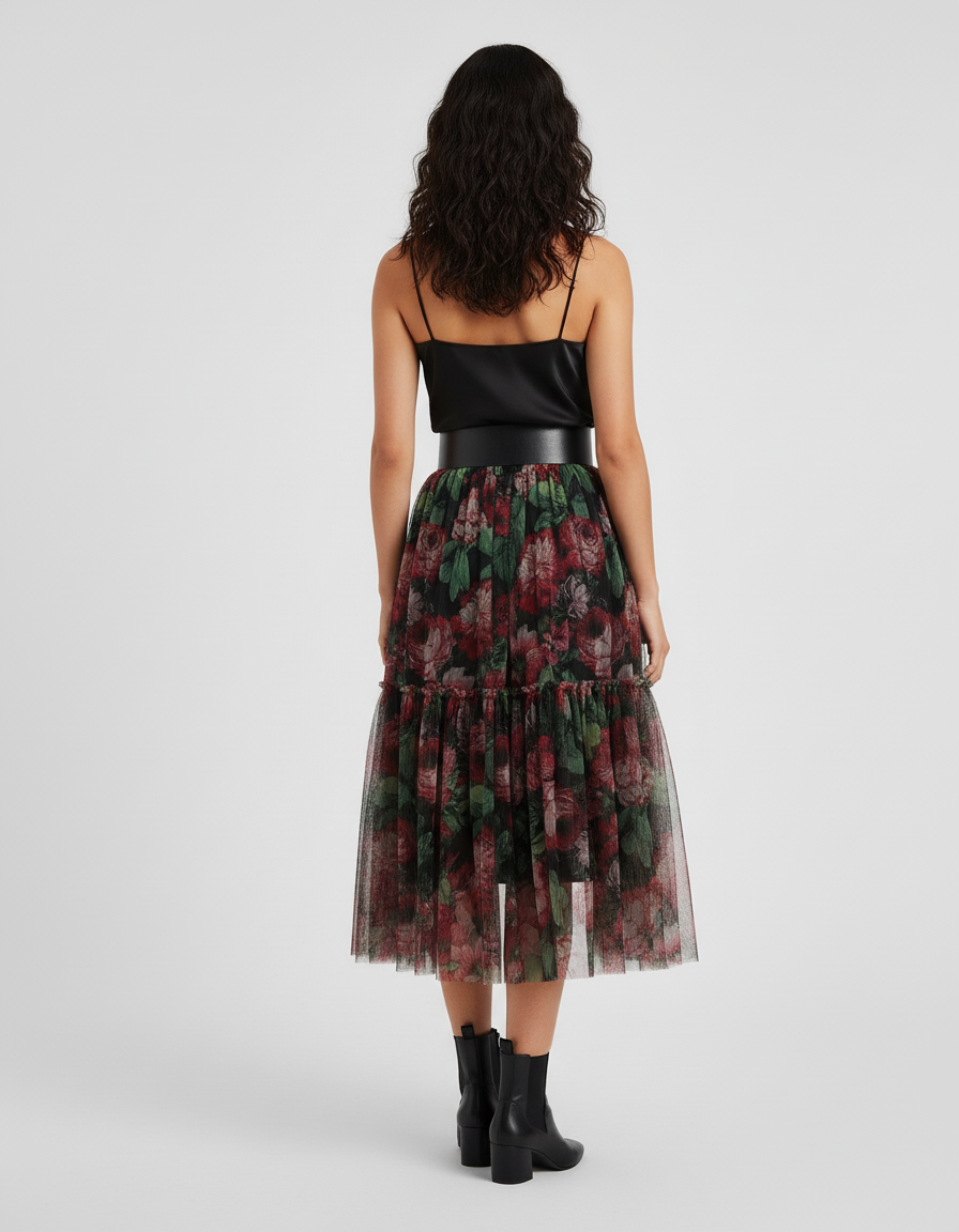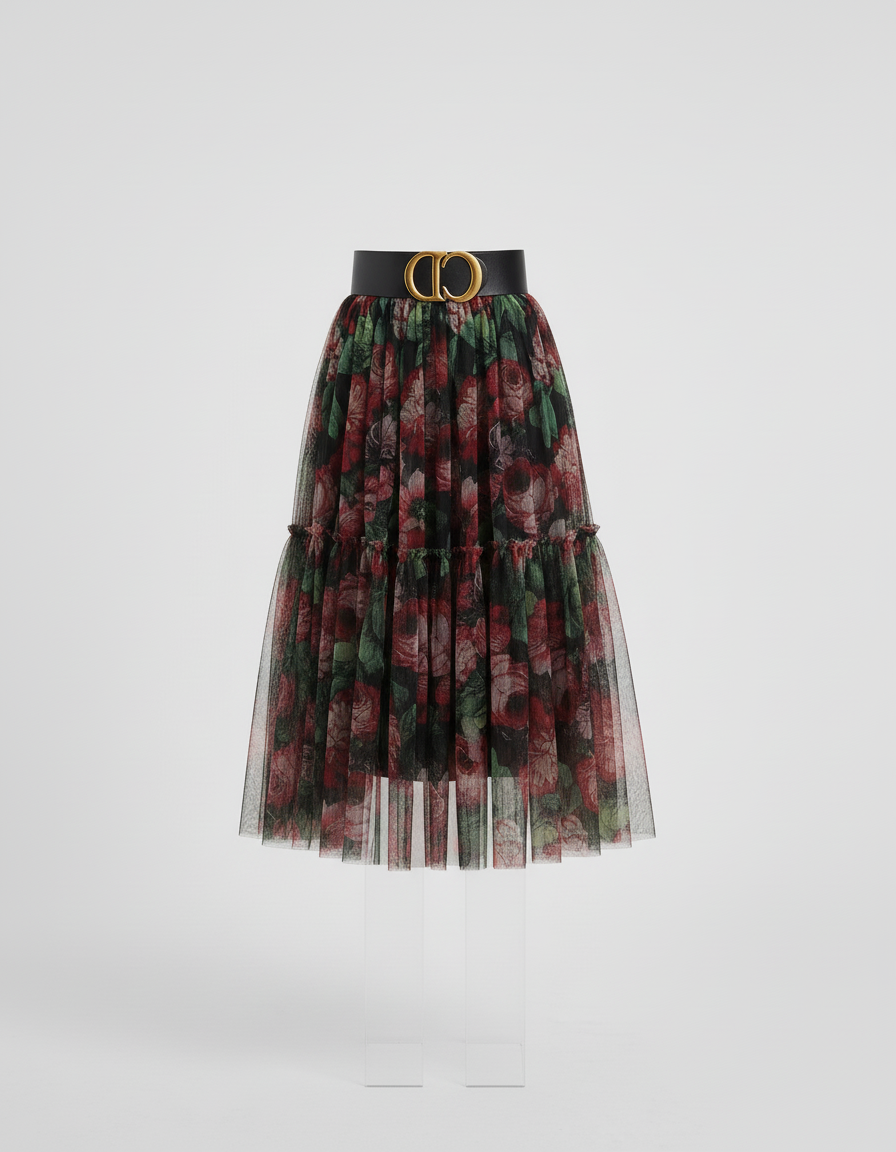 Conçue pour la femme qui ose briller, la Jupe Longue Fete est une célébration du style et de la féminité. Son tulle ample, orné d'un motif floral riche et profond, crée une silhouette spectaculaire et aérienne, parfaite pour les galas, les dîners sophistiqués ou toute occasion où l'on souhaite laisser une impression mémorable. Elle offre une liberté de mouvement gracieuse, vous permettant de danser et de vous mouvoir avec une aisance absolue, tout en captivant les regards par son allure incomparable.