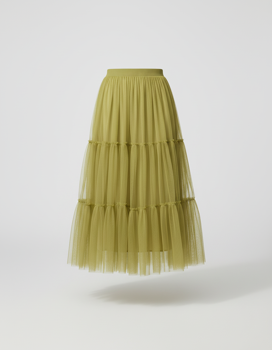 Conçue pour envelopper la silhouette d'une légèreté incomparable, notre jupe longue en tulle vert olive est une ode à la fluidité. Ses volants superposés, délicatement assemblés, créent un mouvement aérien et un tombé d'une grâce infinie qui sublime chaque pas. Le tulle de haute qualité offre une sensation douce sur la peau, garantissant un confort absolu tout au long de la journée, même sous la chaleur estivale. Sa coupe ample assure une liberté de mouvement totale, vous permettant de virevolter avec aisance et élégance, du matin au soir.