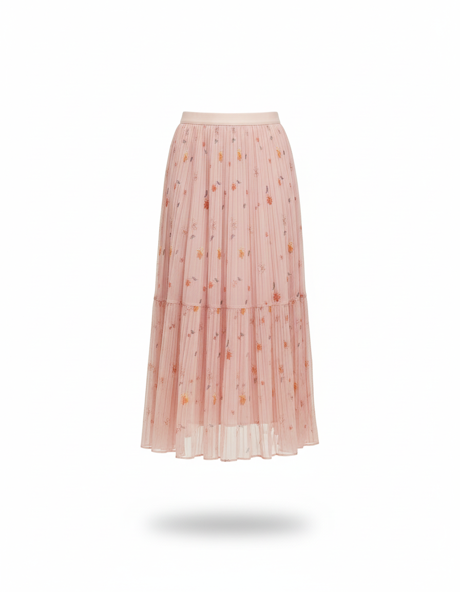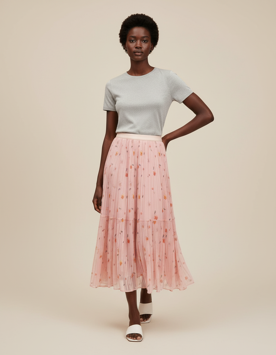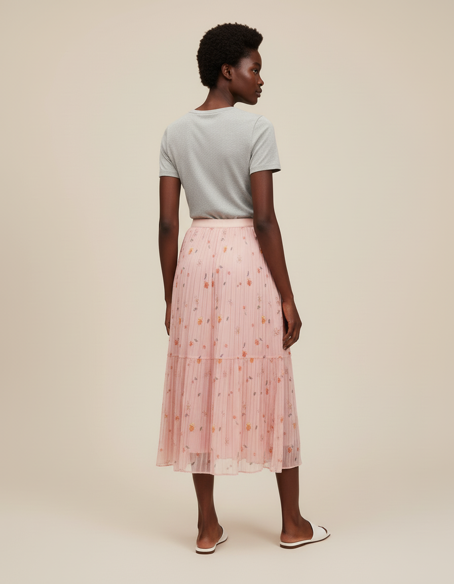 Confectionnée dans une mousseline de haute qualité, chaque pli de cette jupe révèle un motif floral subtil et coloré, évoquant un jardin printanier épanoui. La technique de plissage expert garantit une tenue impeccable et un mouvement captivant à chaque pas, vous distinguant par une fluidité incomparable. Sa taille élastiquée, discrètement intégrée, assure un ajustement parfait et un confort sans compromis. Ce n'est pas qu'une jupe, c'est une invitation à exprimer votre personnalité avec style et confiance, affirmant une allure délicate et un design unique qui ne passe jamais inaperçu.
