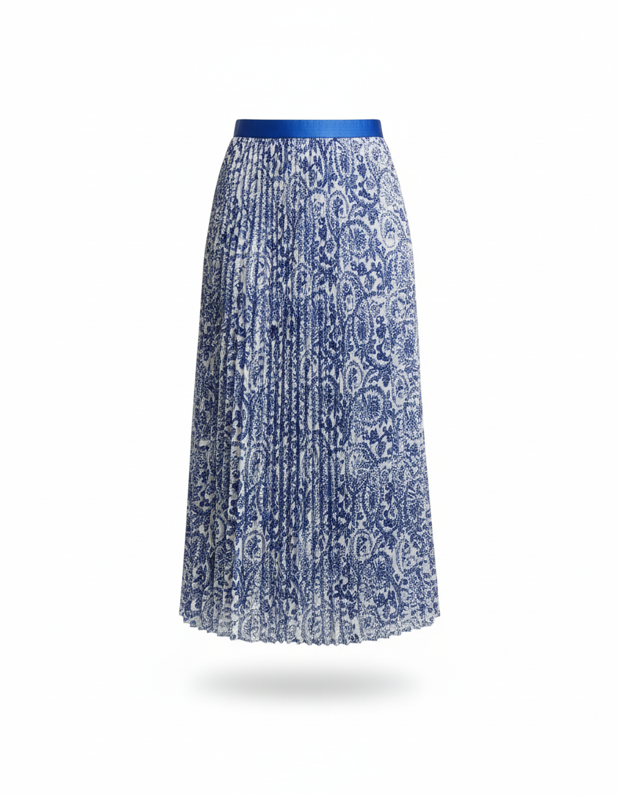 Conçue en mousseline fluide, cette jupe plissée offre un tombé impeccable qui accompagne chacun de vos mouvements avec grâce, sans jamais contraindre. Sa taille élastique assure un confort absolu et une adaptabilité parfaite, vous permettant de la porter toute la journée en toute sérénité. L'imprimé floral bleu et blanc, délicatement dessiné, apporte une touche de fraîcheur et d'originalité à votre garde-robe, faisant de cette pièce un véritable atout pour une allure distinguée et décontractée à la fois.