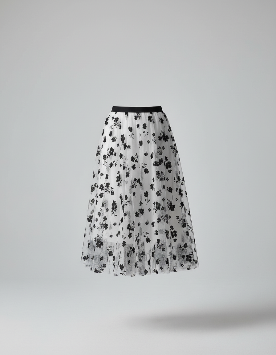 Ce qui distingue véritablement notre jupe, c'est son mariage parfait entre la fluidité aérienne du tulle et la précision de son imprimé. Chaque fleur est pensée pour créer un mouvement harmonieux à chaque pas, offrant une dimension visuelle captivante. Loin des standards, cette jupe est une déclaration de mode subtile, promettant un confort inégalé sans jamais compromettre votre élégance. Elle incarne le luxe moderne, accessible et distinctif, pour une garde-robe où chaque pièce raconte une histoire.