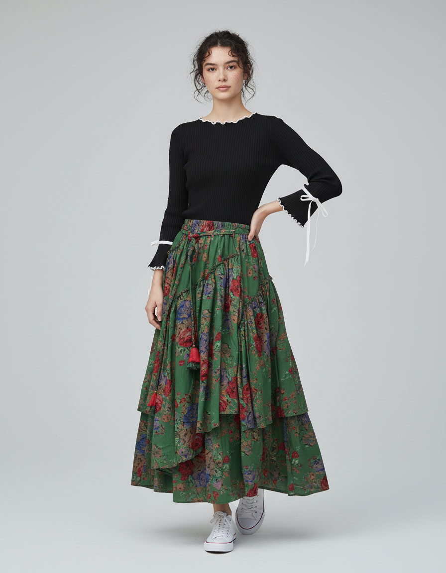 Jupe Longue Florale À Volants Bohème : Modèle Vert Imprimé