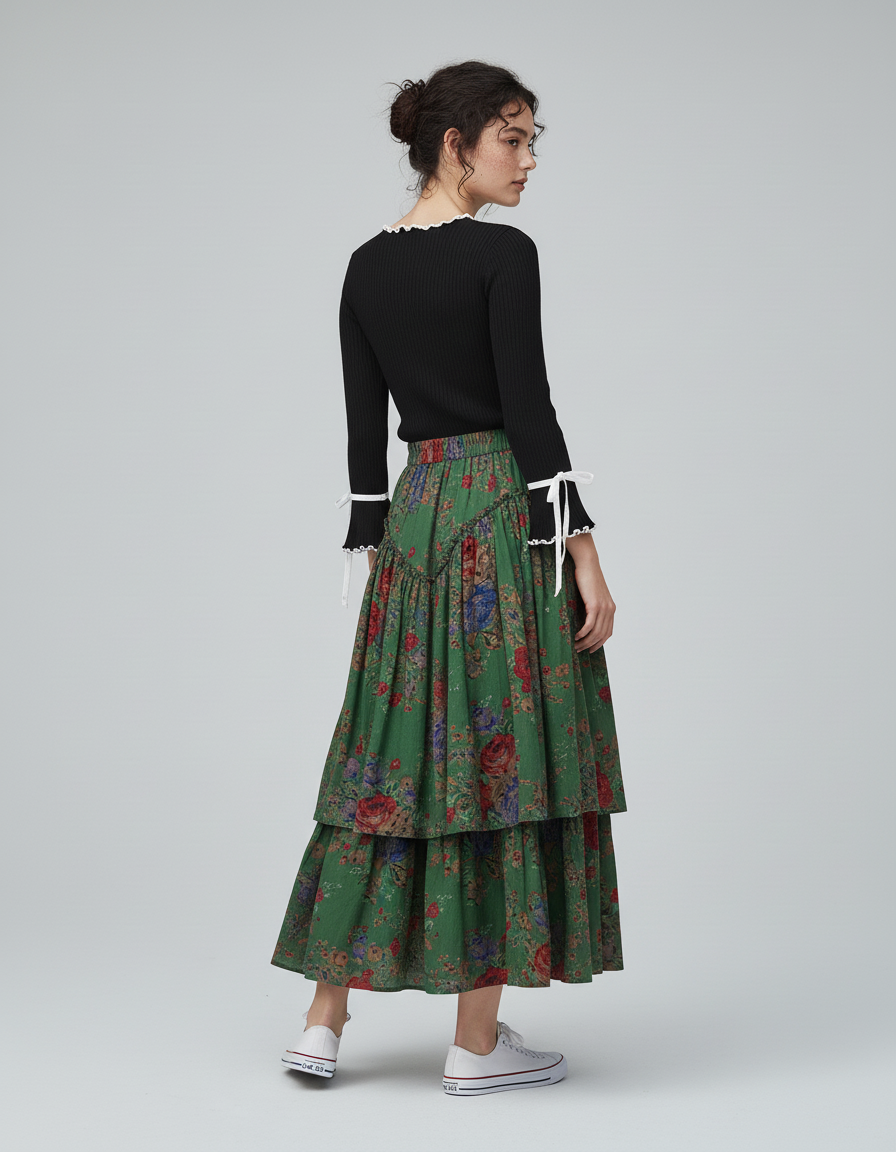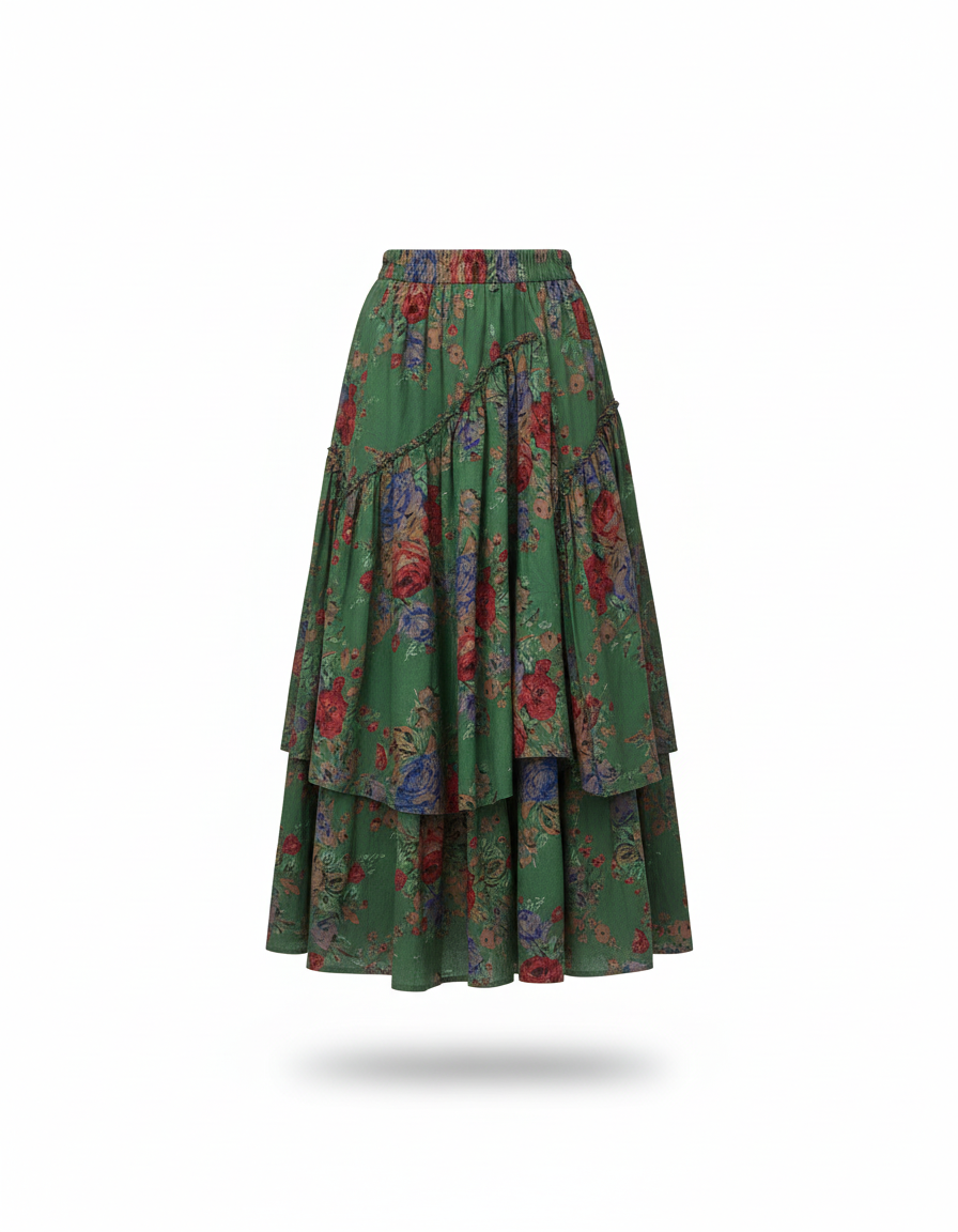 Cette jupe longue présente un motif floral multicolore sur un fond vert. Elle est confectionnée avec plusieurs niveaux de volants.