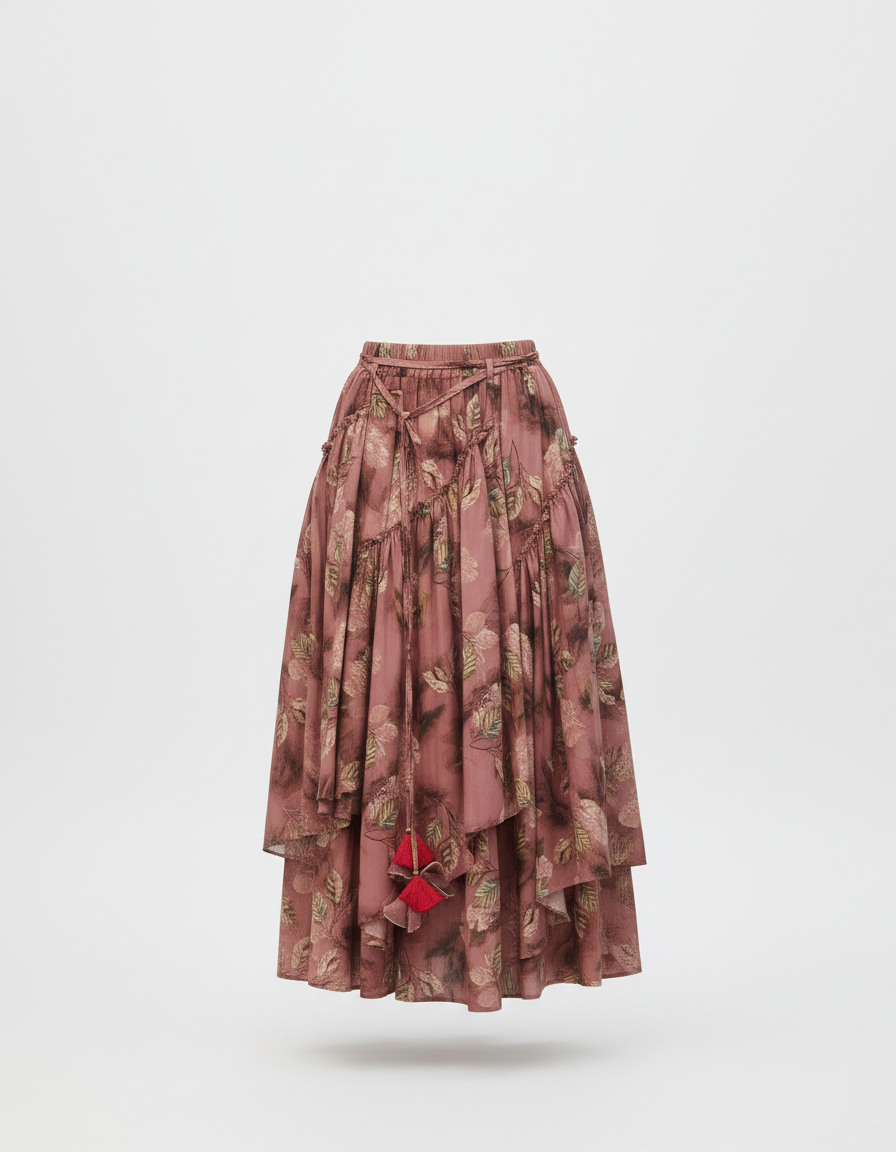 Cette jupe longue présente une coupe asymétrique avec des couches superposées. Elle est imprimée d'un motif floral et feuillu sur un fond rose foncé.