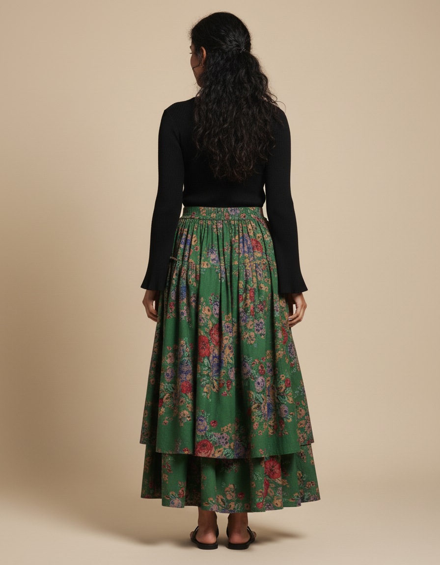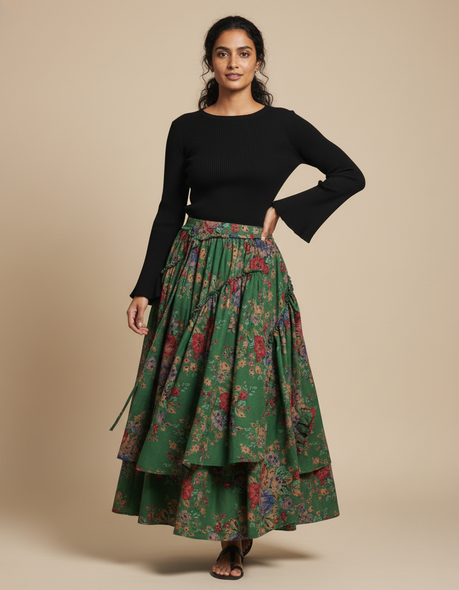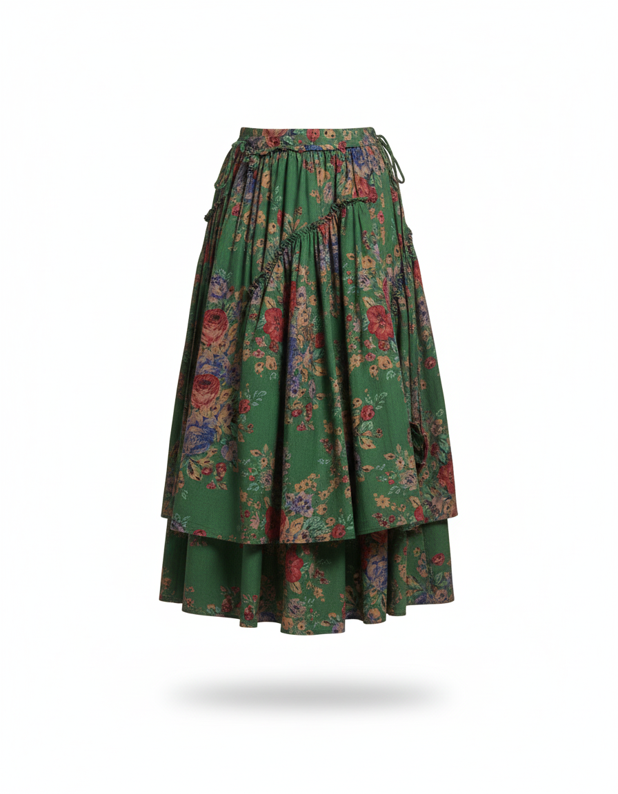 Cette jupe longue présente un motif floral sur un fond vert. Elle est conçue avec des étages superposés et des volants.