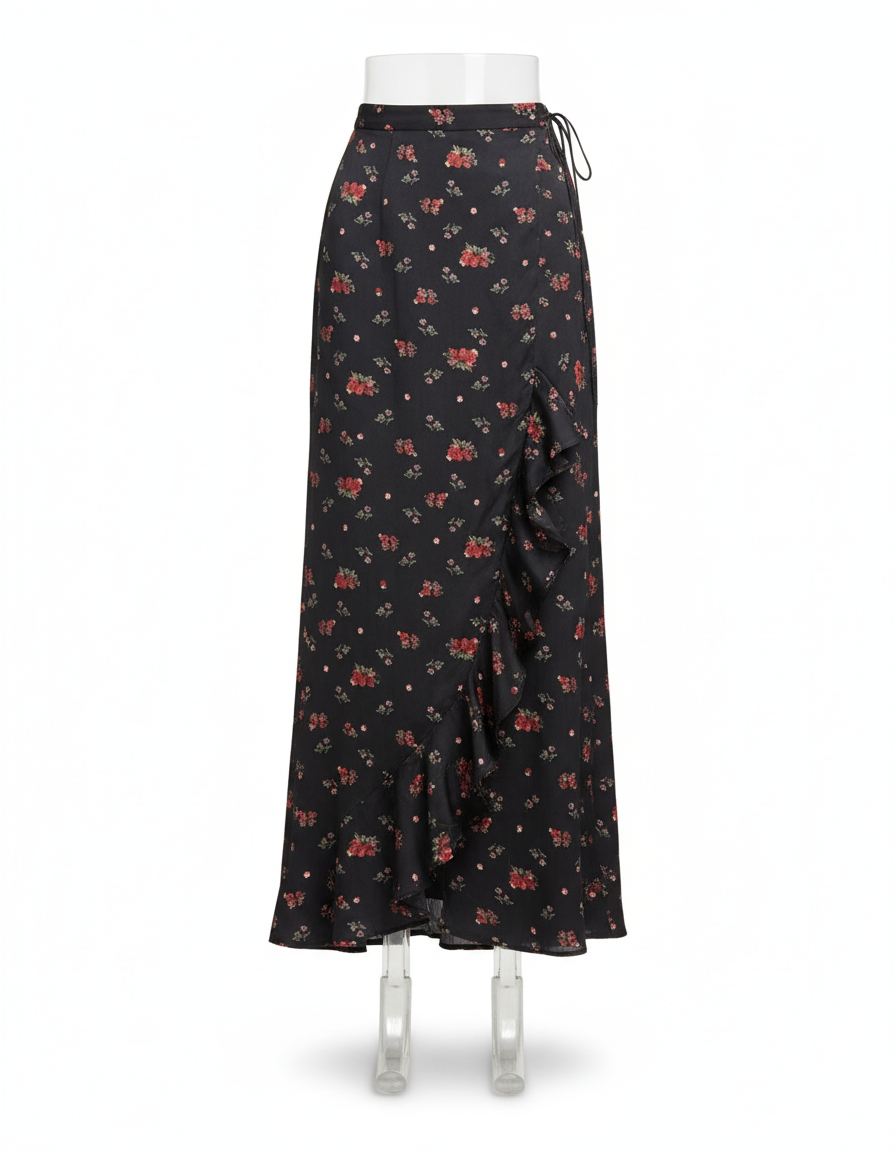 Découvrez la Jupe Longue Florale Fendue Fluide, une pièce maîtresse qui réinvente l'élégance moderne. Conçue pour la femme qui ose affirmer son style avec aisance, cette jupe asymétrique en satin, au motif floral délicat sur fond sombre, est une invitation à la fluidité et à la confiance. Son design portefeuille, sublimé par une fente audacieuse et des volants subtils, offre une silhouette dynamique et sophistiquée. Elle est l'incarnation parfaite du luxe décontracté, idéale pour celles qui recherchent une pièce polyvalente capable de passer d'un look jour chic à une soirée élégante avec une facilité déconcertante.