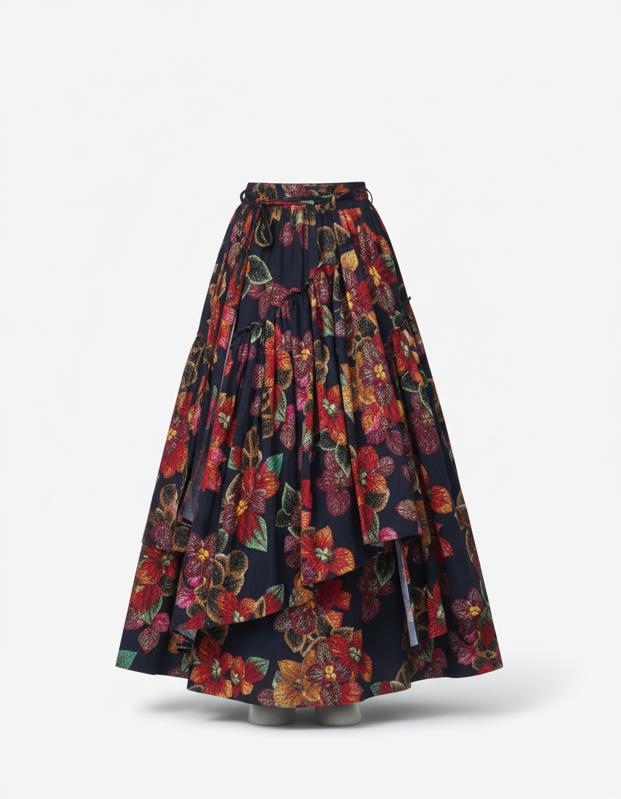 Ce qui la distingue ? Son imprimé floral riche et vibrant, inspiré des jardins d'antan, se déploie sur un fond profond, créant un contraste saisissant et une profondeur visuelle unique. L'audace de sa structure asymétrique, rehaussée par des volants délicatement superposés, insuffle un dynamisme contemporain à son charme vintage. Ce n'est pas seulement une jupe, c'est une déclaration de style, une œuvre d'art textile qui promet de captiver les regards et de vous envelopper d'une aura d'élégance singulière, vous permettant de vous démarquer avec une touche de luxe moderne.