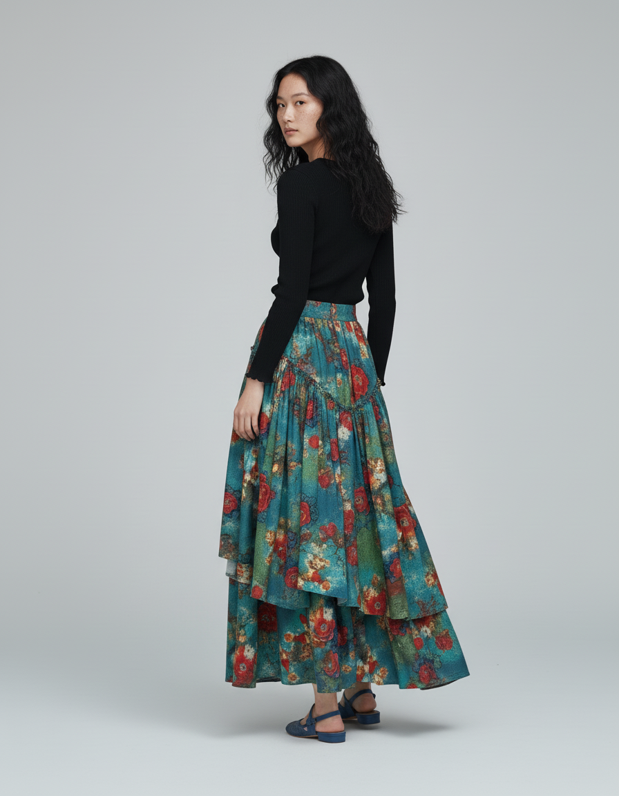 Laissez libre cours à votre créativité avec la Jupe Longue Florale Superposée Bohème, une pièce maîtresse conçue pour s'adapter à chaque facette de votre vie. Pour une allure décontractée en journée, associez-la à un simple top uni et des sandales plates, laissant le motif floral vibrant s'exprimer pleinement. En soirée ou pour une occasion spéciale, transformez-la avec un chemisier en soie ajusté et des talons, ou des bottines élégantes, pour un look chic et sophistiqué. Son design asymétrique et ses volants ajoutent une dimension unique, garantissant que vous ferez toujours sensation, quelle que soit l'assemblage.