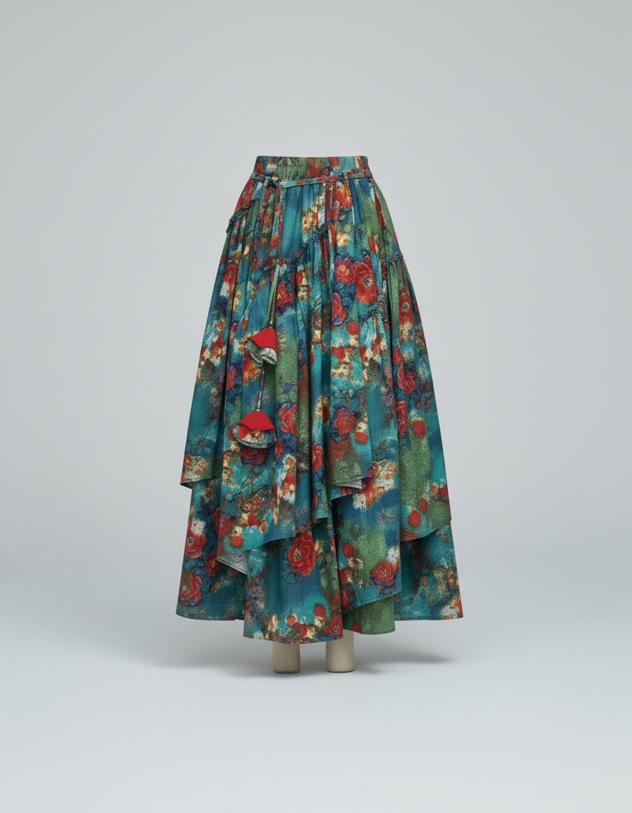 Cette jupe longue présente un motif floral détaillé sur un tissu aux teintes de vert et de rouge. Sa coupe superposée ajoute du volume et du mouvement à l'ensemble.