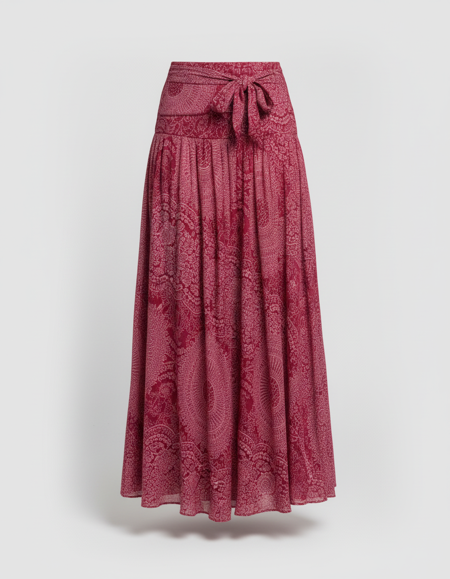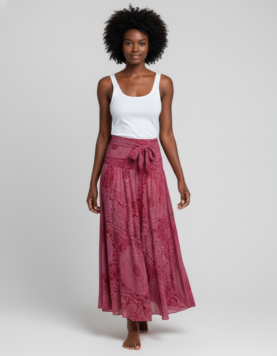 Cette jupe peut être portée pour des occasions décontractées ou comme tenue quotidienne. Sa matière fluide est adaptée aux climats chauds et aux moments de détente.
