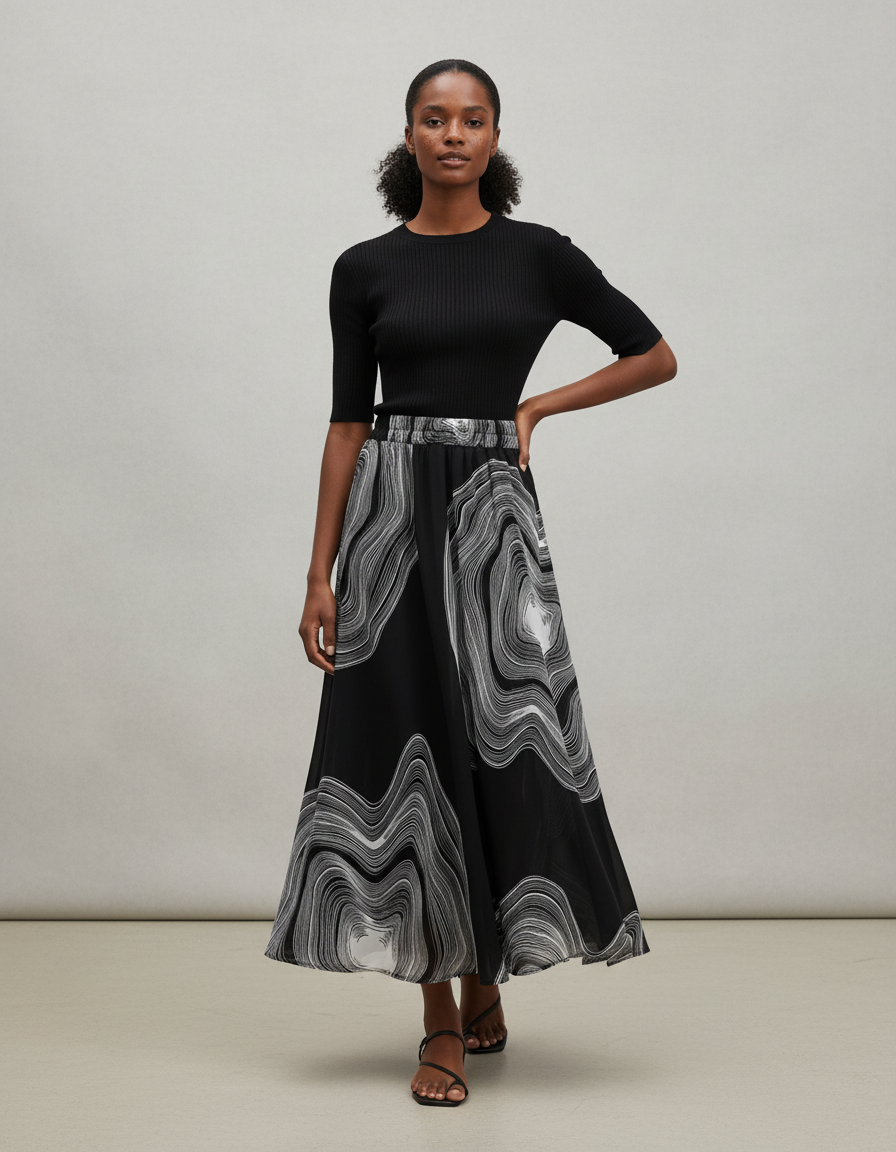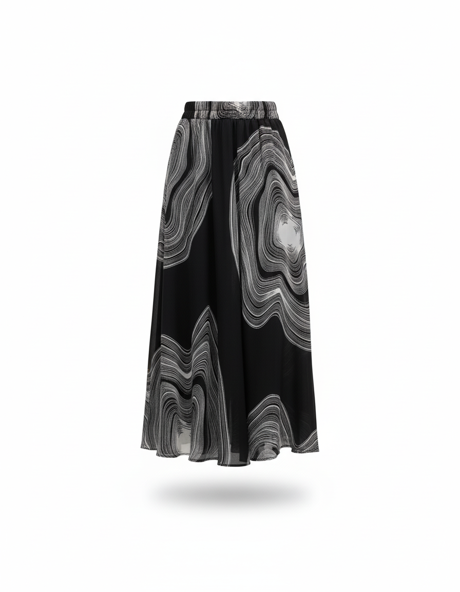 Adoptez un style distinctif et aérien avec cette jupe longue fluide au motif ondulé.