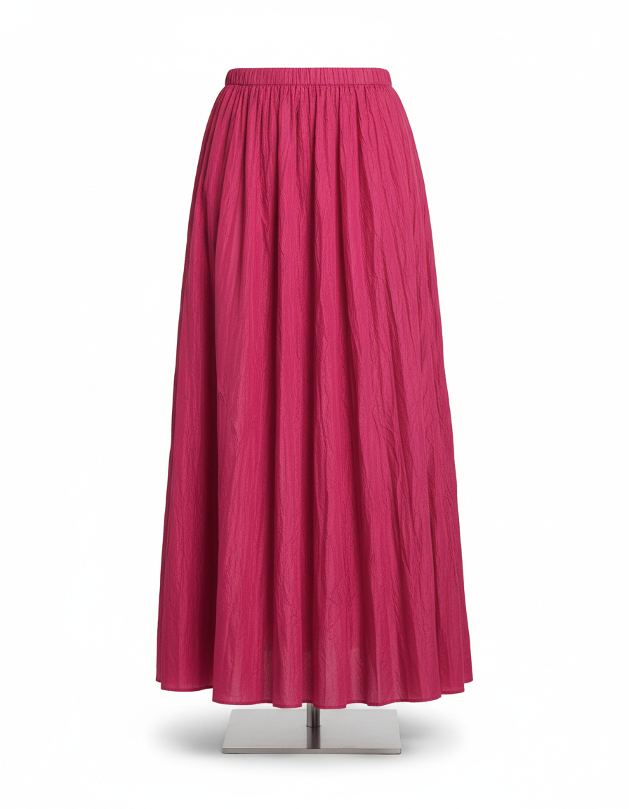 Cette jupe longue présente une couleur fuchsia unie et une coupe évasée. Elle est dotée d'une taille élastiquée et d'un tissu à l'aspect froissé.