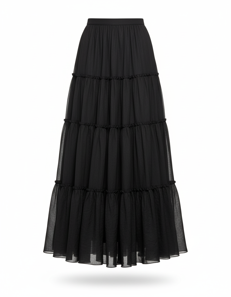 Cette jupe est une jupe longue de style maxi. Elle est conçue en chiffon avec une taille haute.