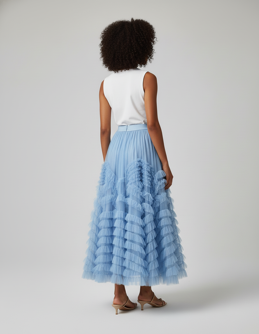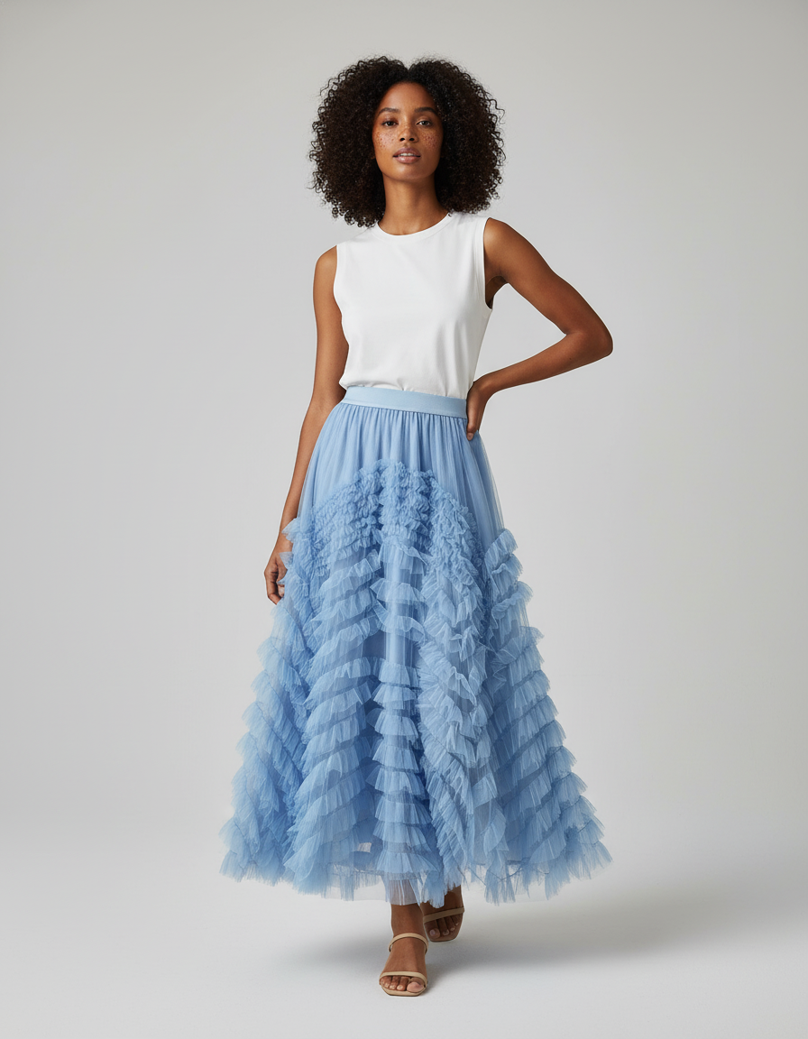 La Jupe Longue Gonflante en tulle bleu, pièce maîtresse de notre collection, transcende les codes de la cérémonie pour s'inviter dans un éventail d'occasions. Pour un événement formel ou une célébration spéciale, associez-la à un top en soie ajusté et des talons délicats, incarnant une élégance aérienne et raffinée. Osez la décontracter avec un simple t-shirt blanc et des baskets épurées pour un look moderne et audacieux qui ne manquera pas de faire sensation lors d'un brunch stylé ou d'une soirée estivale. Sa couleur bleue profonde et son volume spectaculaire offrent une base versatile pour exprimer votre créativité.