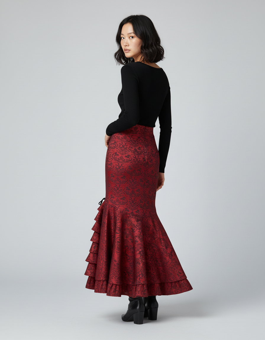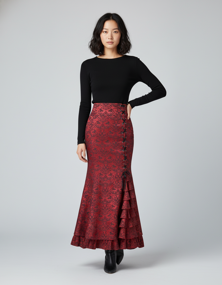 Cette jupe longue présente un motif baroque de couleur rouge et noire. Elle est conçue avec une coupe sirène, agrémentée de volants et d'un détail de laçage sur un côté.