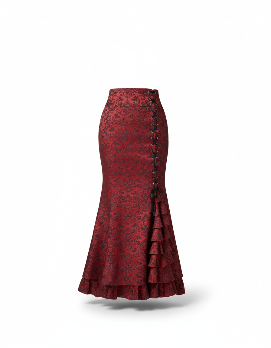 Ce qui distingue cette jupe, c'est son alliance audacieuse de détails emblématiques. Son tissu bordeaux, orné d'un motif damassé subtil, capte la lumière et les regards. Le laçage corset latéral, à la fois sensuel et structuré, s'ouvre sur une cascade de volants délicats, ajoutant un mouvement dramatique et une touche romantique inattendue. Plus qu'un vêtement, c'est une œuvre qui fusionne l'héritage gothique avec une esthétique contemporaine de luxe, vous garantissant une allure inoubliable et résolument chic.