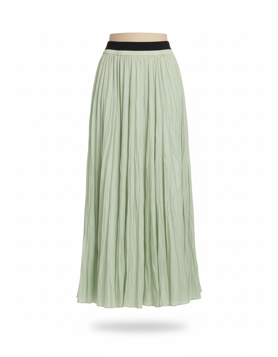 Cette jupe longue présente une silhouette évasée avec un tissu froissé. Elle est de couleur vert clair et atteint la longueur des chevilles.