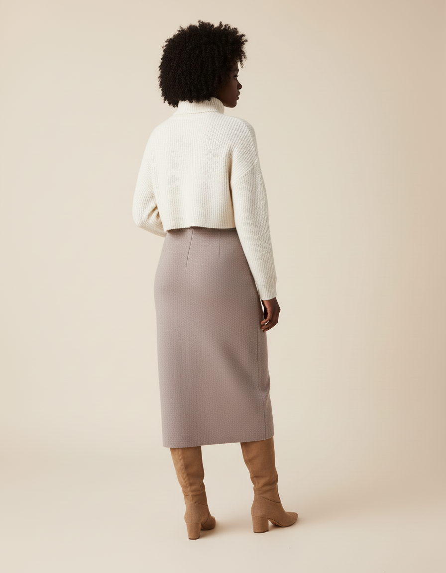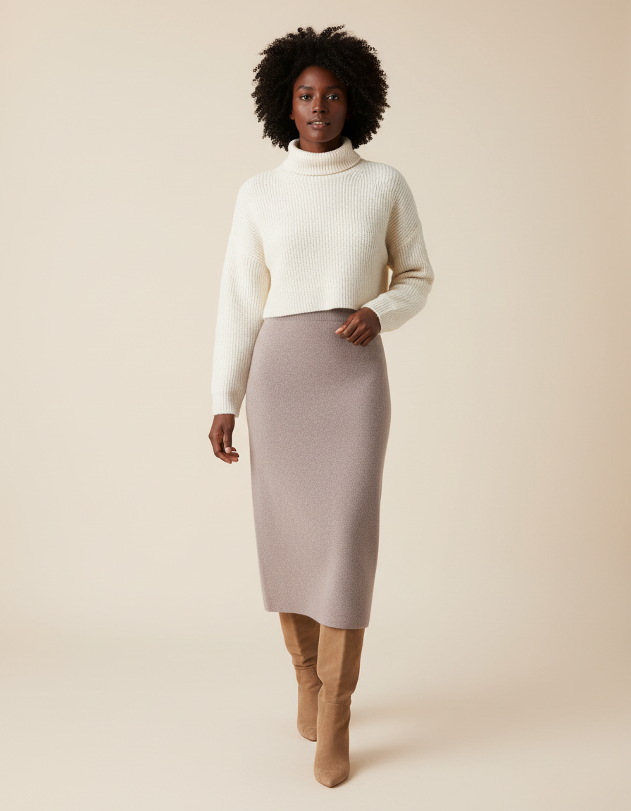 Conçue dans une maille douce et de haute qualité, cette jupe moulante offre un confort inégalé sans jamais compromettre votre liberté de mouvement. Son tombé impeccable épouse délicatement vos formes, assurant une silhouette élancée et élégante en toutes circonstances. Idéale pour l'hiver, elle vous enveloppe de chaleur tout en conservant une fluidité qui vous permettra de vous déplacer avec aisance et confiance, du matin jusqu'au soir.