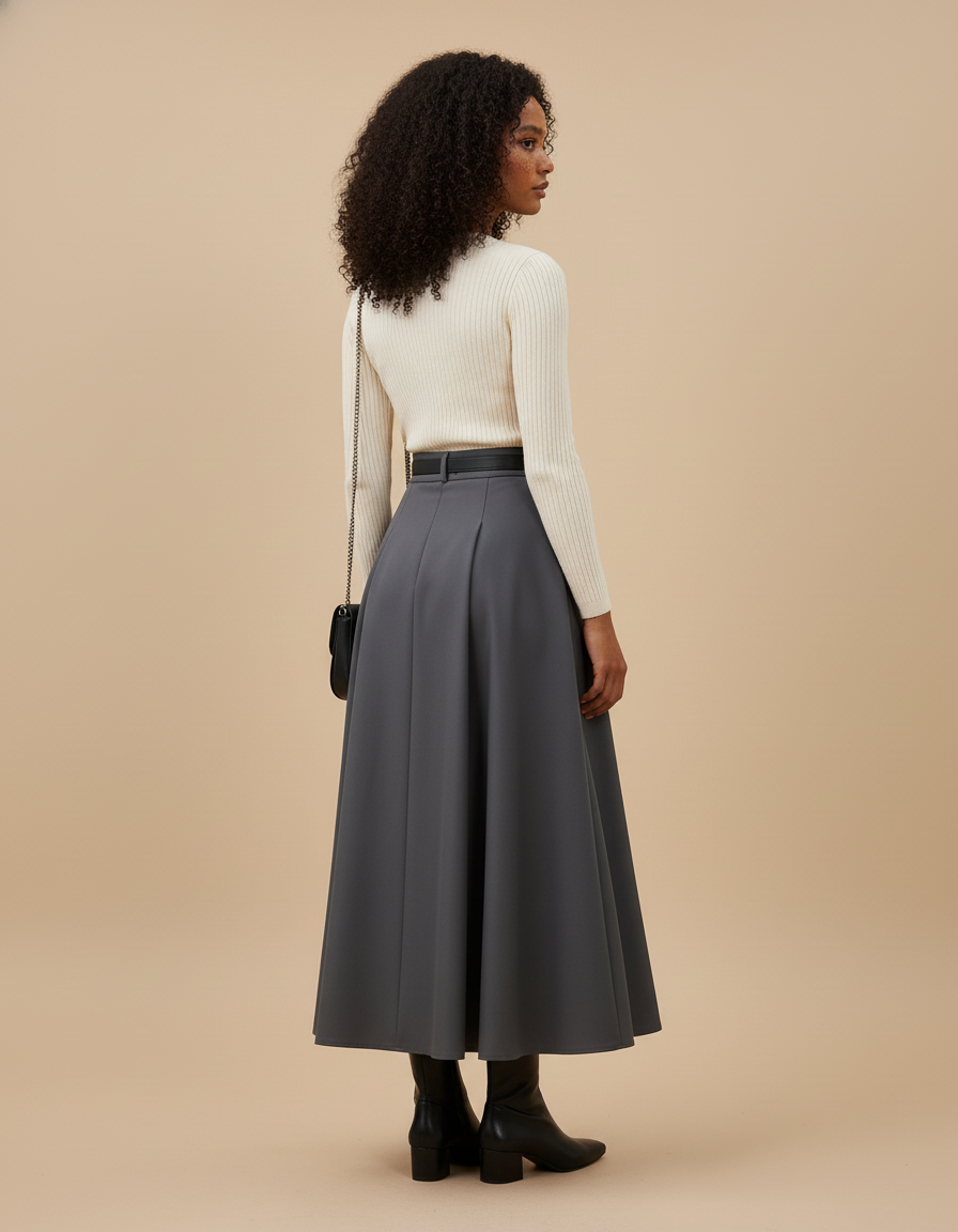 La Jupe Longue Grise Évasée Élégante à Taille Haute